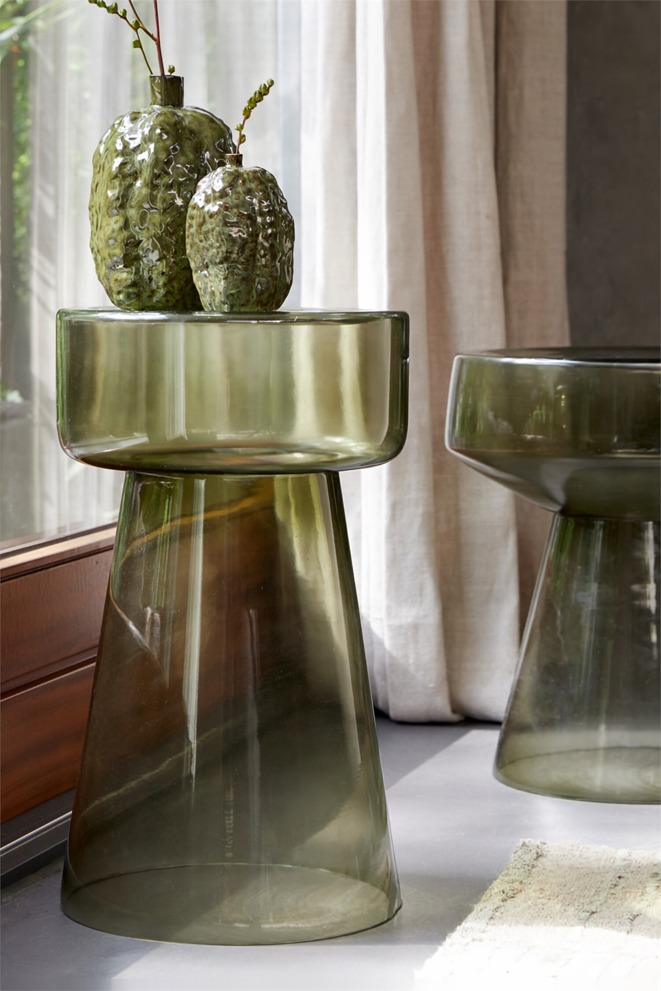 Серый стеклянный приставной столик Dakwa диаметром 37 см выглядит привлекательно, не пренебрегая своей функцией. Поставьте его рядом с диваном, чтобы создать место для напитков, ламп или личных сокровищ, и привлекайте внимание своим уникальным дизайном. Привлекательное сочетание искусства и практичности, этот столик украсит ваше пространство и вдохновит на беседу. Размер: 37 x 37 x 44