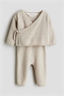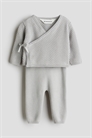 H&M Adorables. Трикотажный комплект из кардигана и брюк из мягкого хлопкового микса. Кардиган из фактурного трикотажа с ребристой отделкой, V-образным вырезом горловины, завязками с одной стороны и потайной пуговицей с другой. Брюки с эластичной, утягивающейся талией и ребристыми краями. Коллекция H&M Adorables - это подборка удобных и качественных вещей, не теряющих актуальности.