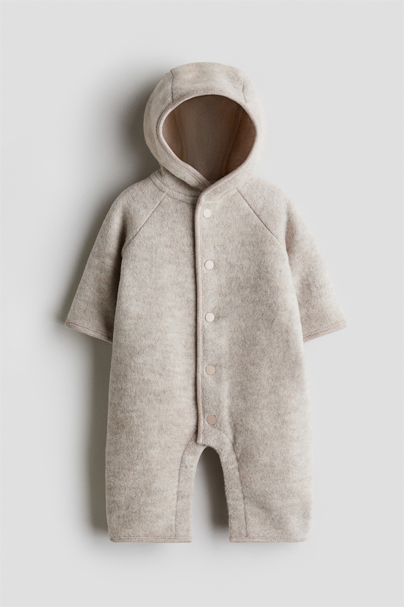 H&M Adorables. Детский комбинезон с капюшоном из мягкого флиса из шерстяной смеси с трикотажными вставками. Застежки на кнопки спереди и длинные рукава реглан. Манжеты и манжеты с отворотами для сохранения тепла, а также скрытые кнопки на ножках для удобства переодевания. Коллекция H&M Adorables - это подборка удобных и качественных вещей, не теряющих актуальности.