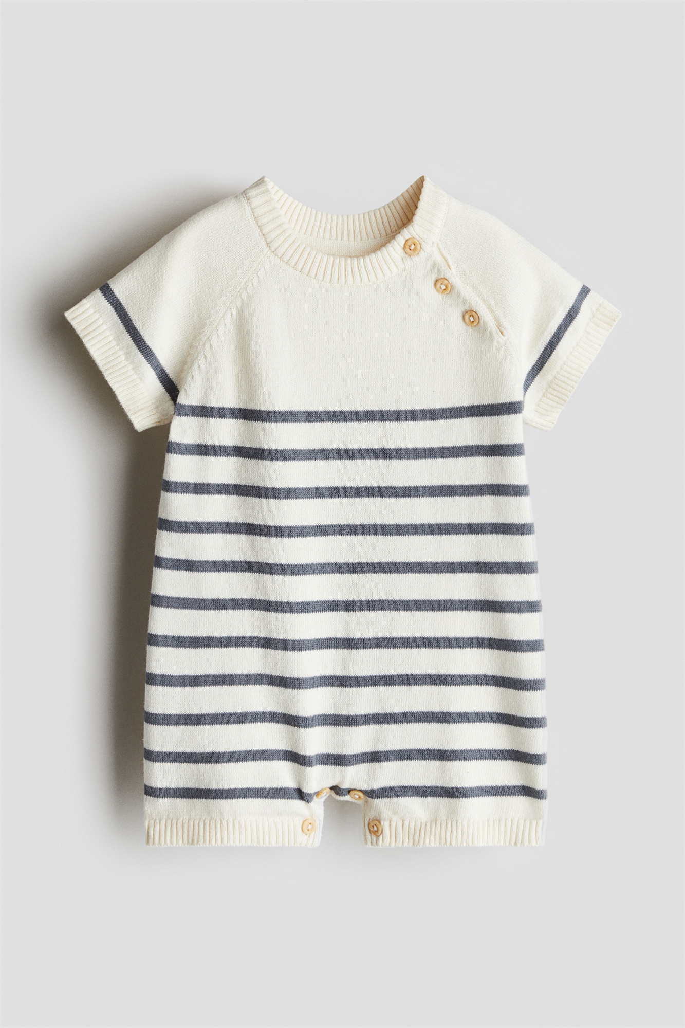 Костюм-ромпер с короткими рукавами из мягкого тонкого трикотажного хлопка с круглым вырезом в рубчик и застежкой на пуговицы на одном плече. Пуговицы внизу для удобства переодевания и тесемки на манжетах и подол.
