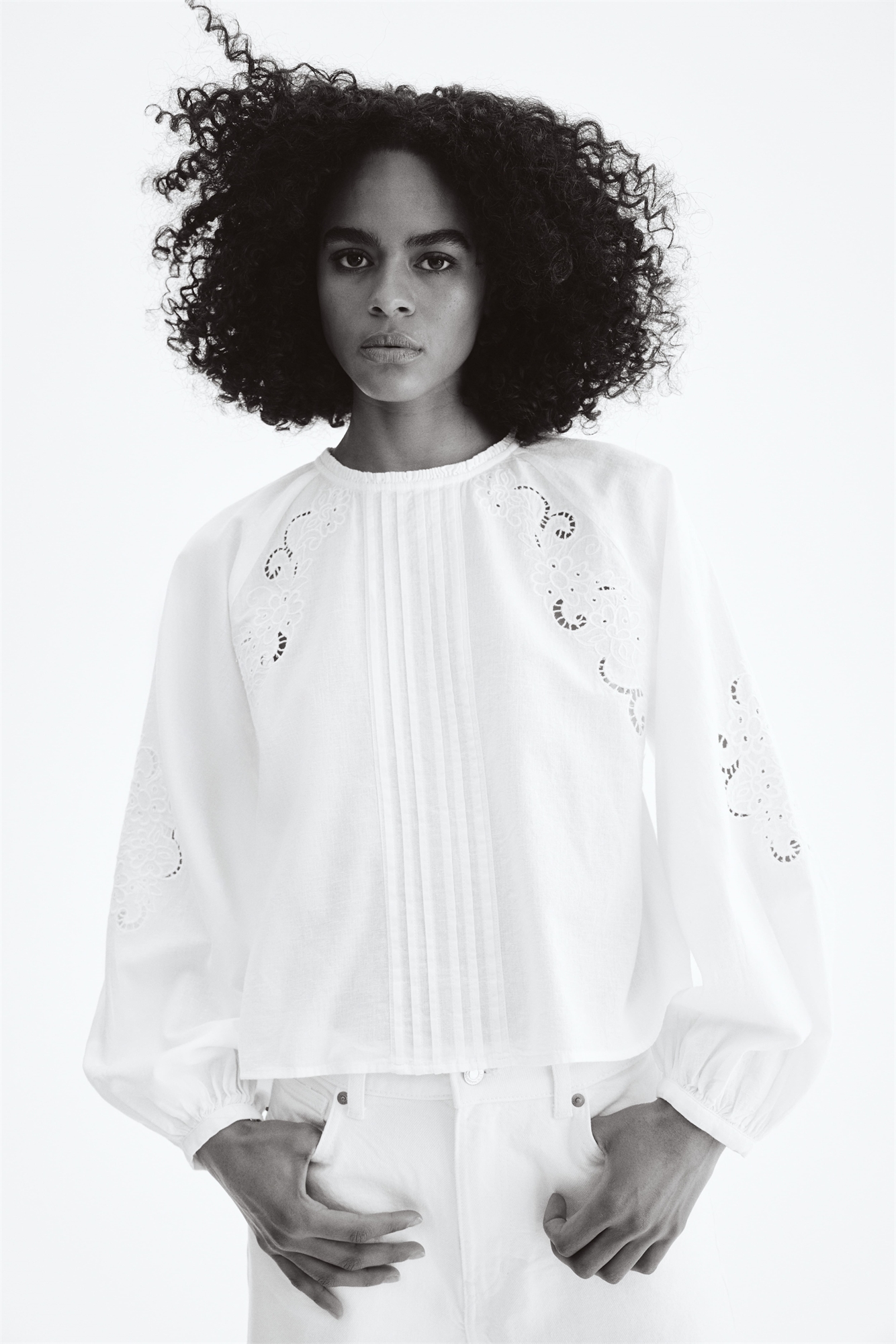 Свободная блузка из воздушного хлопка и льна, декорированная пинтаками и бродери-англиз. Круглый вырез с оборками, отверстие для ключа с потайной пуговицей сзади и длинные рукава реглан с узкими манжетами на пуговицах.