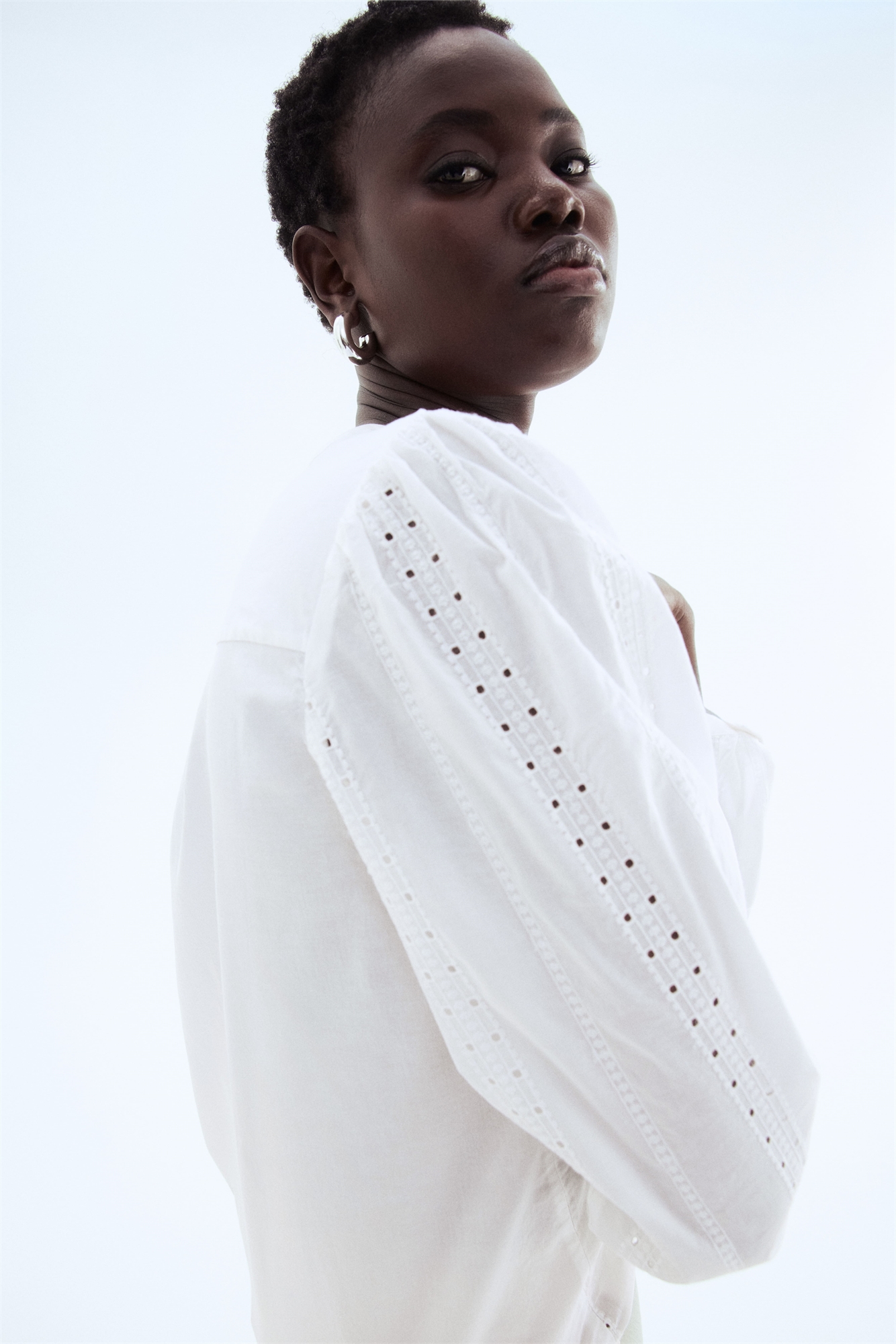 Свободная блузка из воздушного хлопкового полотна, украшенная полосками тон-в-тон broderie anglaise. Воротник-бант, V-образная пройма спереди и ярмо со сборками спереди и сзади. Длинные пышные рукава с узкими манжетами на пуговицах.