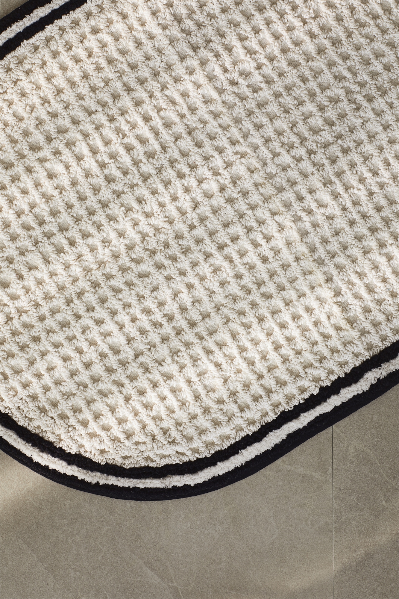 Коврик для ванной из хлопкового полотна с ворсистым, вафельным узором и черной каймой. Противоскользящие протекторы на обратной стороне.