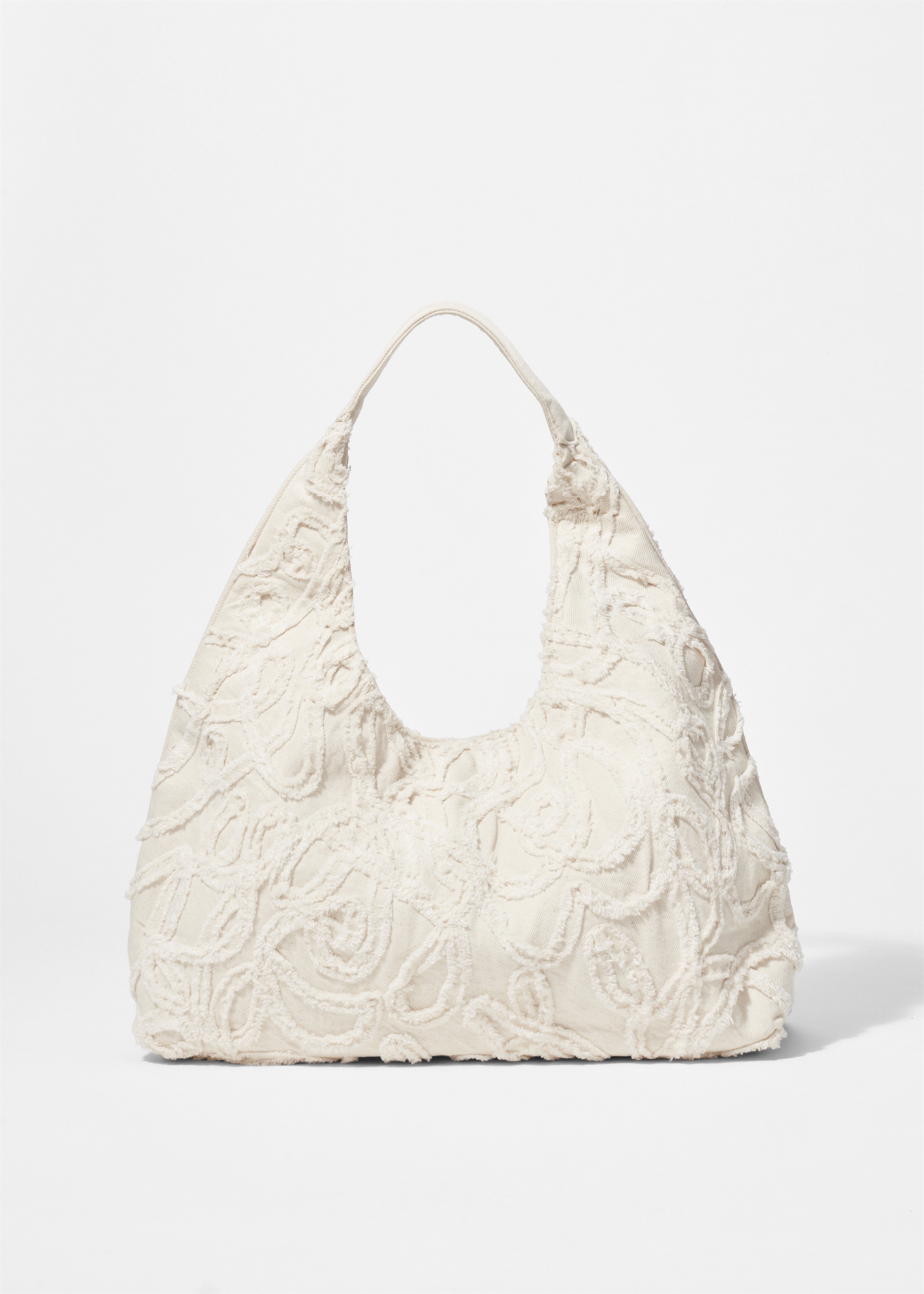 Небольшая сумка-тоут из хлопкового денима, украшенная аппликацией по необработанному краю в виде замысловатого узора, вдохновленного цветочными мотивами. Внутренний карман и потайная застежка. Подкладка из хлопковой саржи Ширина: 34 см / 13,4” Высота по центру: 28 см / 11” Глубина: 12 см / 4,7”