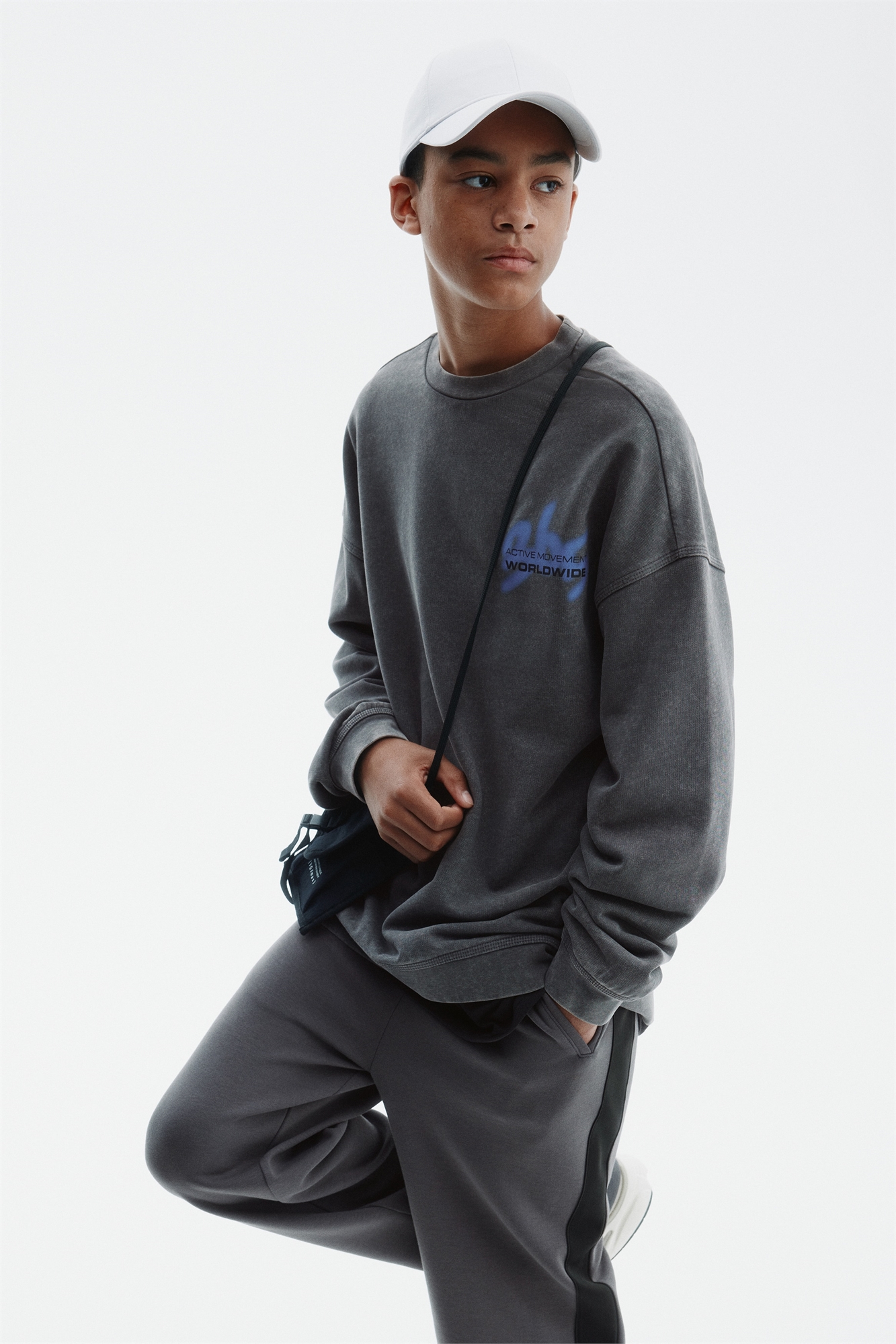 Спортивная толстовка из хлопковой ткани средней плотности с круглым вырезом в рубчик, спущенными плечами, длинными рукавами и широкими лентами на манжетах и подоле.