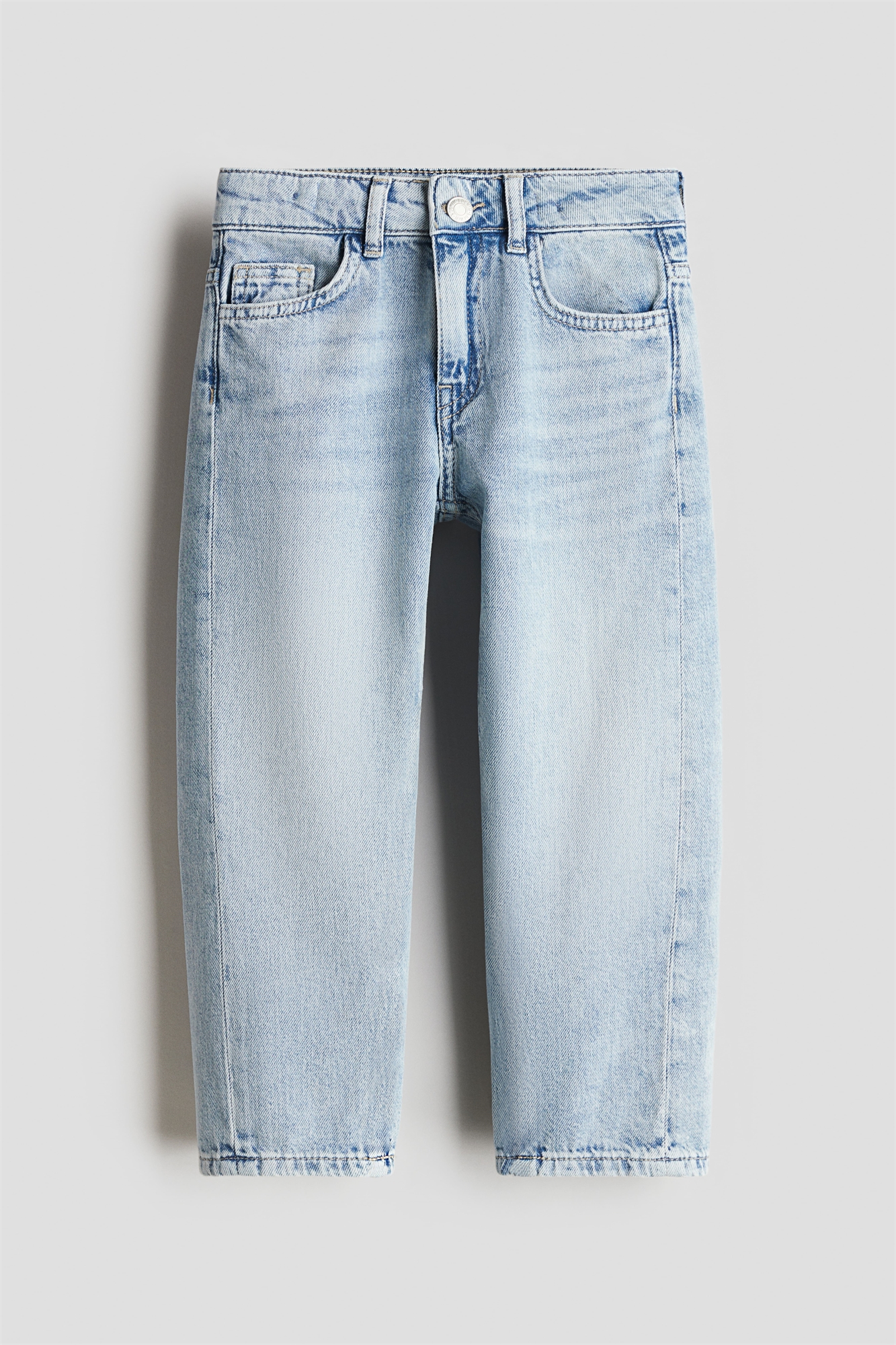 Джинсы с 5 карманами из мягкого хлопкового денима. Свободный крой по бедрам и ляжкам с шарообразными ногами. Регулируемый эластичный пояс, ширинка на молнии с кнопкой и изогнутый боковой шов по ногам.