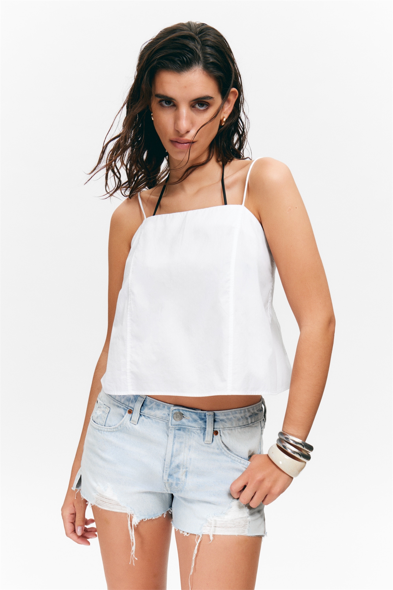 Свободный топ на бретелях с квадратным вырезом и силуэтом "кокон". Созданный из хрустящего хлопкового поплина, он имеет ультратонкие бретели-спагетти и мягкую сборку спереди, а также завязывающийся сзади шнурок из ткани-ракушки. Модель имеет аккуратные швы и небольшой боковой карман.
