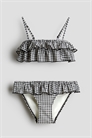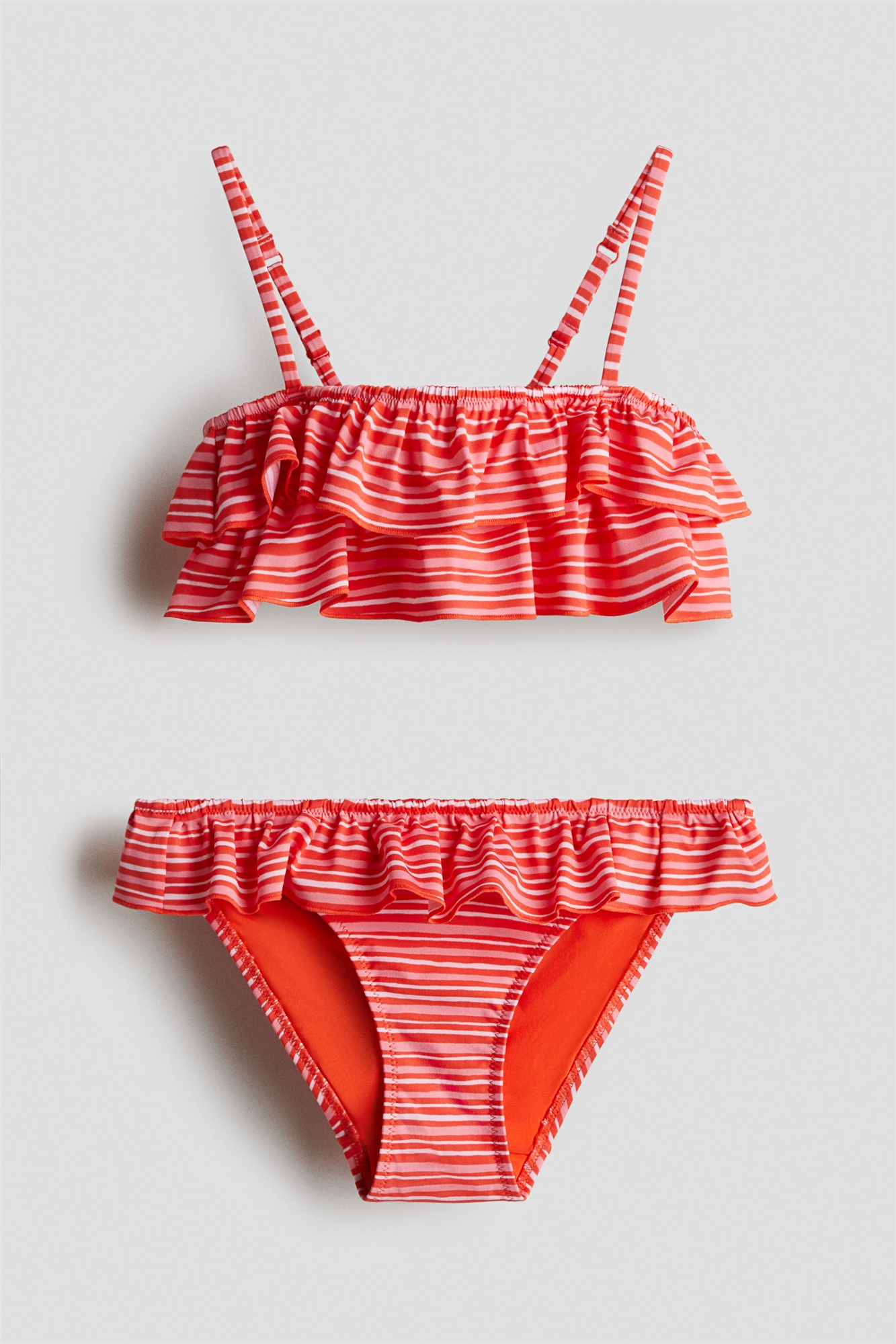 Полностью закрытое бикини с принтом по всей поверхности. Верхняя часть бикини с воланами, узкими регулируемыми бретелями и эластичной отделкой по верхнему краю. Низ бикини с воланом на талии.