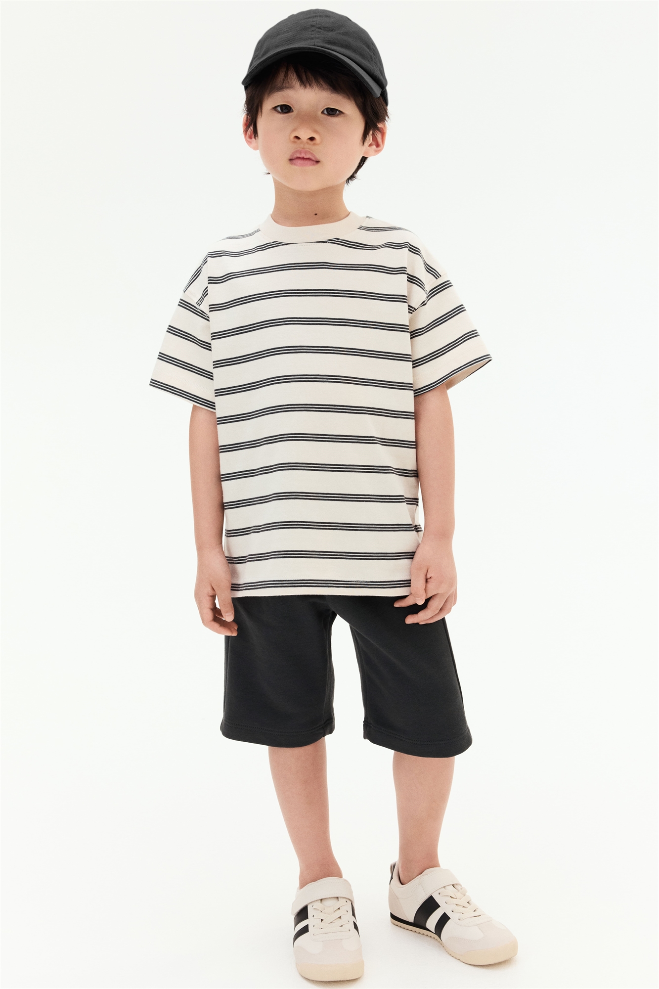Комплект из футболки и шорт. Футболка из мягкого хлопкового джерси с круглым вырезом в рубчик и спущенными плечами. Шорты из легкой толстовочной ткани с эластичным утягивающим поясом и диагональными передними карманами.