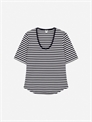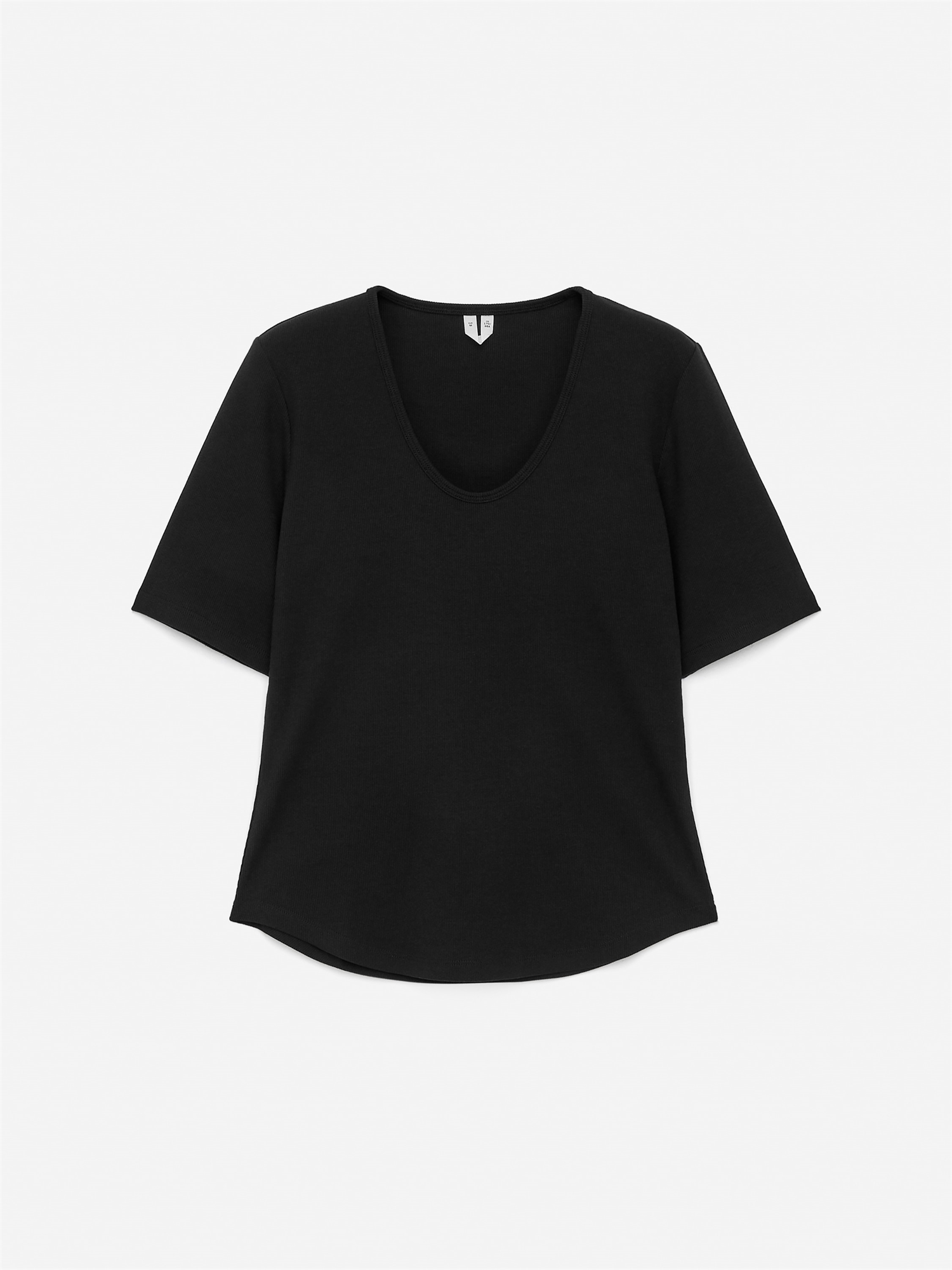 Футболка с ребристой фактурой по всей длине, которая придает телу облегающий вид. С короткими облегающими рукавами и вырезом горловины. Изогнутая линия подола.