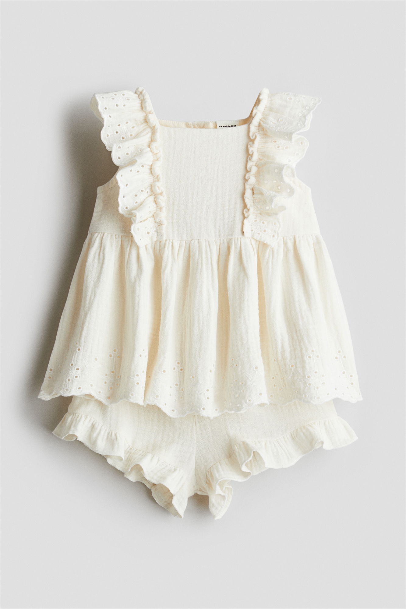 H&M Adorables. Комплект из топа и шорт из мягкого муслина, изготовленного из высококачественного хлопка. Топ без рукавов с отделкой бродери англез с квадратным вырезом, воланами с гребешками в верхней части, переходящими на плечи, и сборками на талии. Застежка на пуговицы сзади. Шорты с регулируемой, эластичной талией и оборками по краям. Коллекция H&M Adorables - это подборка удобных и качественных вещей, не теряющих актуальности.