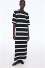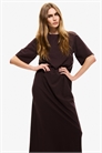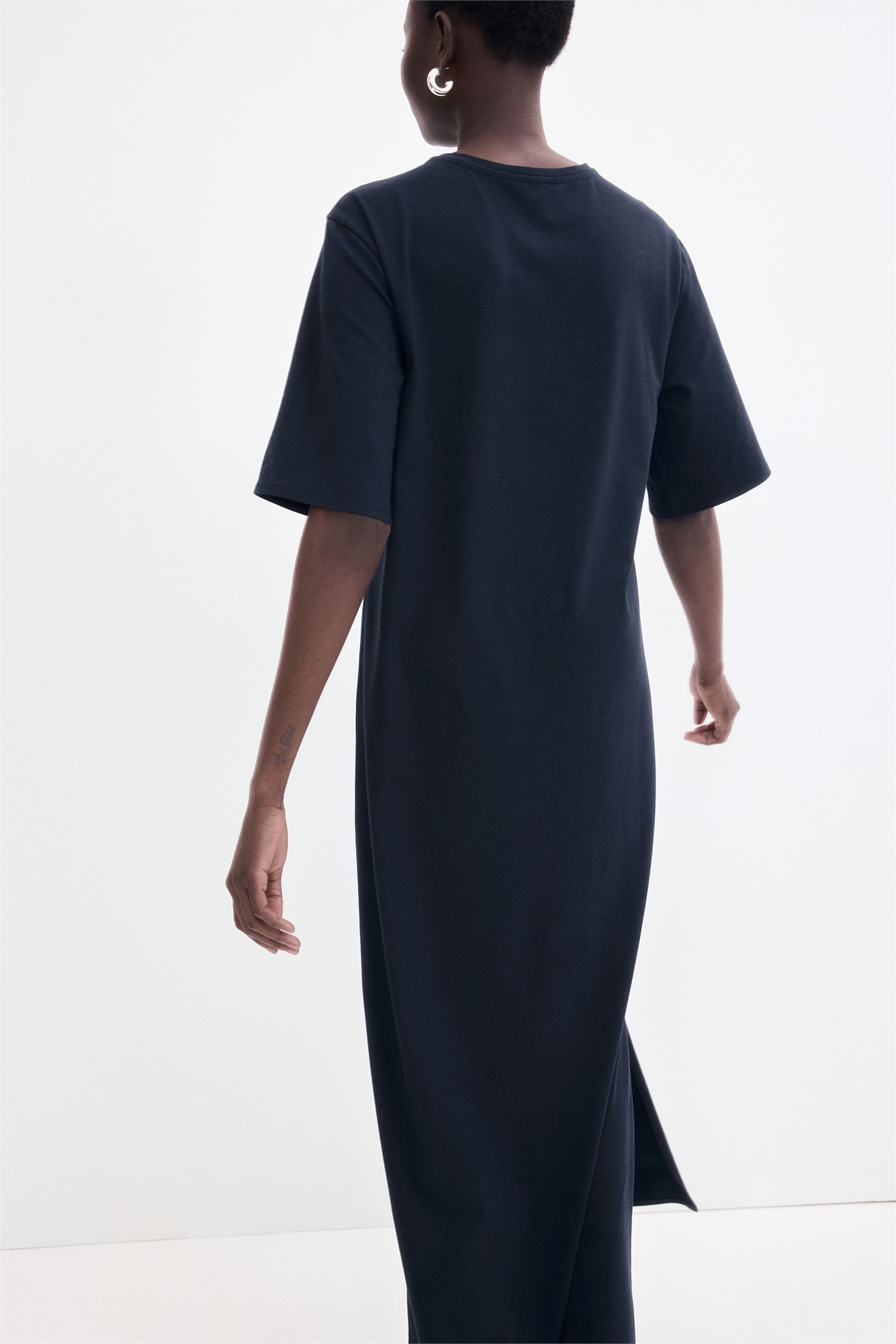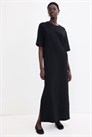 Длинное платье-футболка из мягкого трикотажа с круглым вырезом и слегка спущенными плечами. Подол прямого покроя с высоким разрезом с одной стороны.