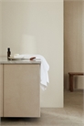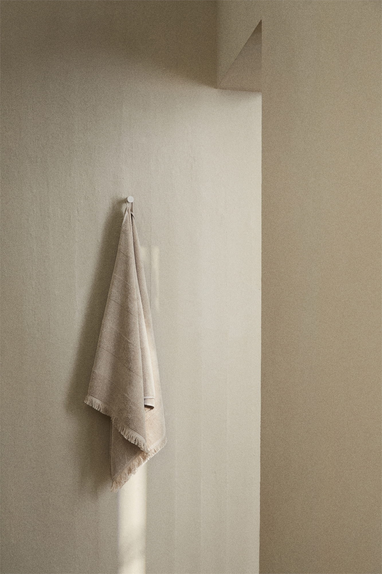 Полотенце для рук из хлопковой махры с ворсом разной высоты, создающим тонкий полосатый узор. С бахромой на коротких сторонах и вешалкой на одной длинной стороне.