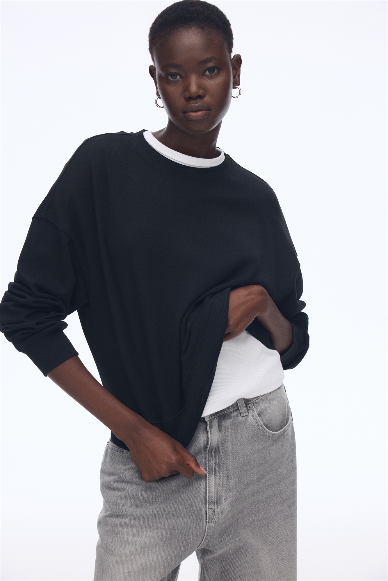 Топ из легкого толстовочного материала из смеси хлопка. Горловина, спущенные плечи и длинные рукава. Манжеты и подол с ребрами жесткости.