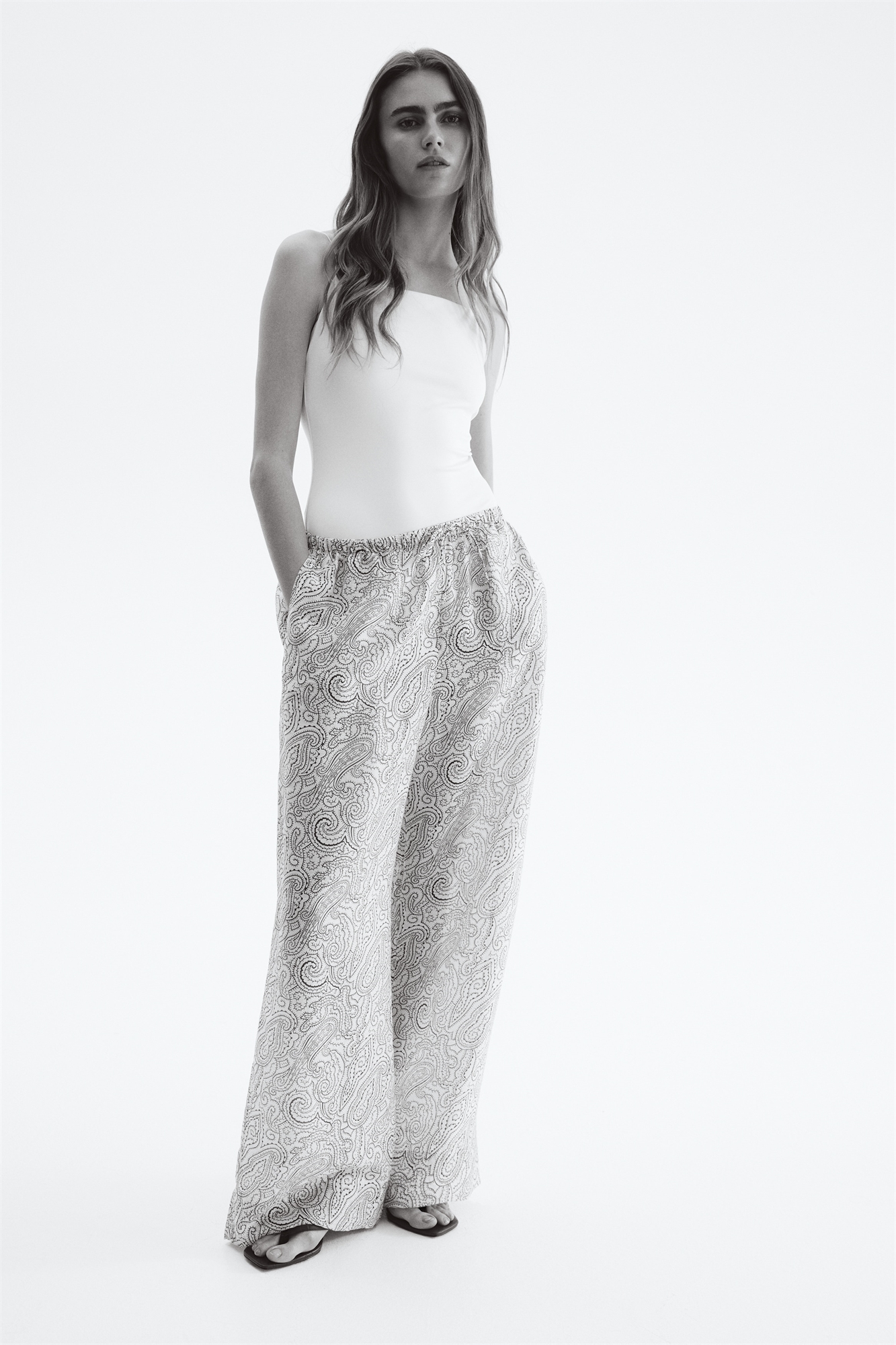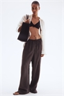 Свободные брюки свободного кроя из ткани с блестками. Высокая талия с эластичной отделкой и утягивающим шнурком, неброские боковые карманы и широкие штанины.
