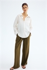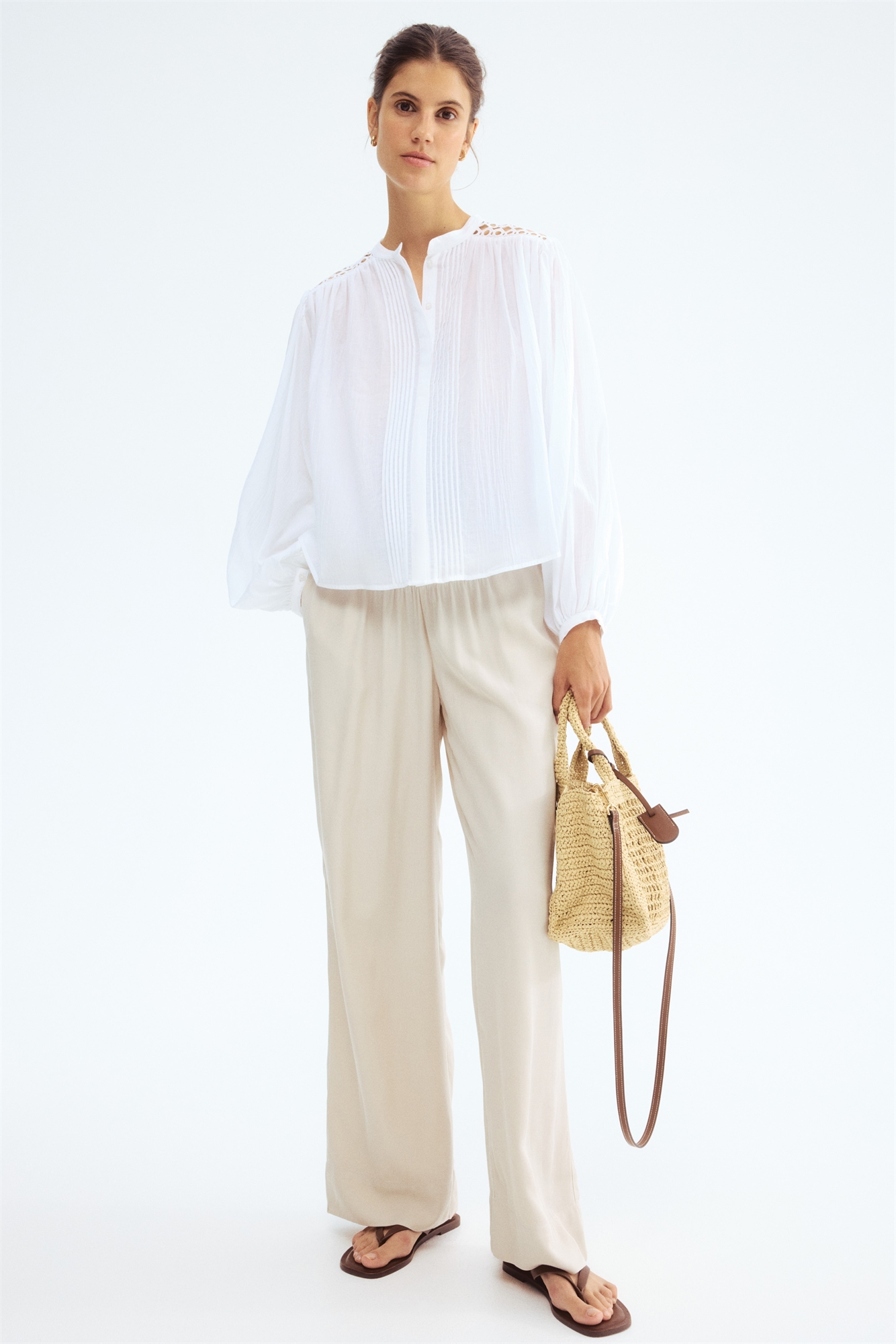 Брюки из вискозной саржи с заниженной, эластичной талией, неброскими боковыми карманами, фальшивыми карманами сзади и прямыми ногами.