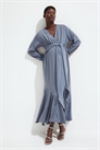Платье длиной до щиколоток из крепа с V-образным вырезом и потайными пуговицами в верхней части. Двухслойный ярмо сзади и длинные широкие завязки под бюстом. Длинные рукава с манжетами на пуговицах и струящаяся юбка со швом над подолом. Без отделки.
