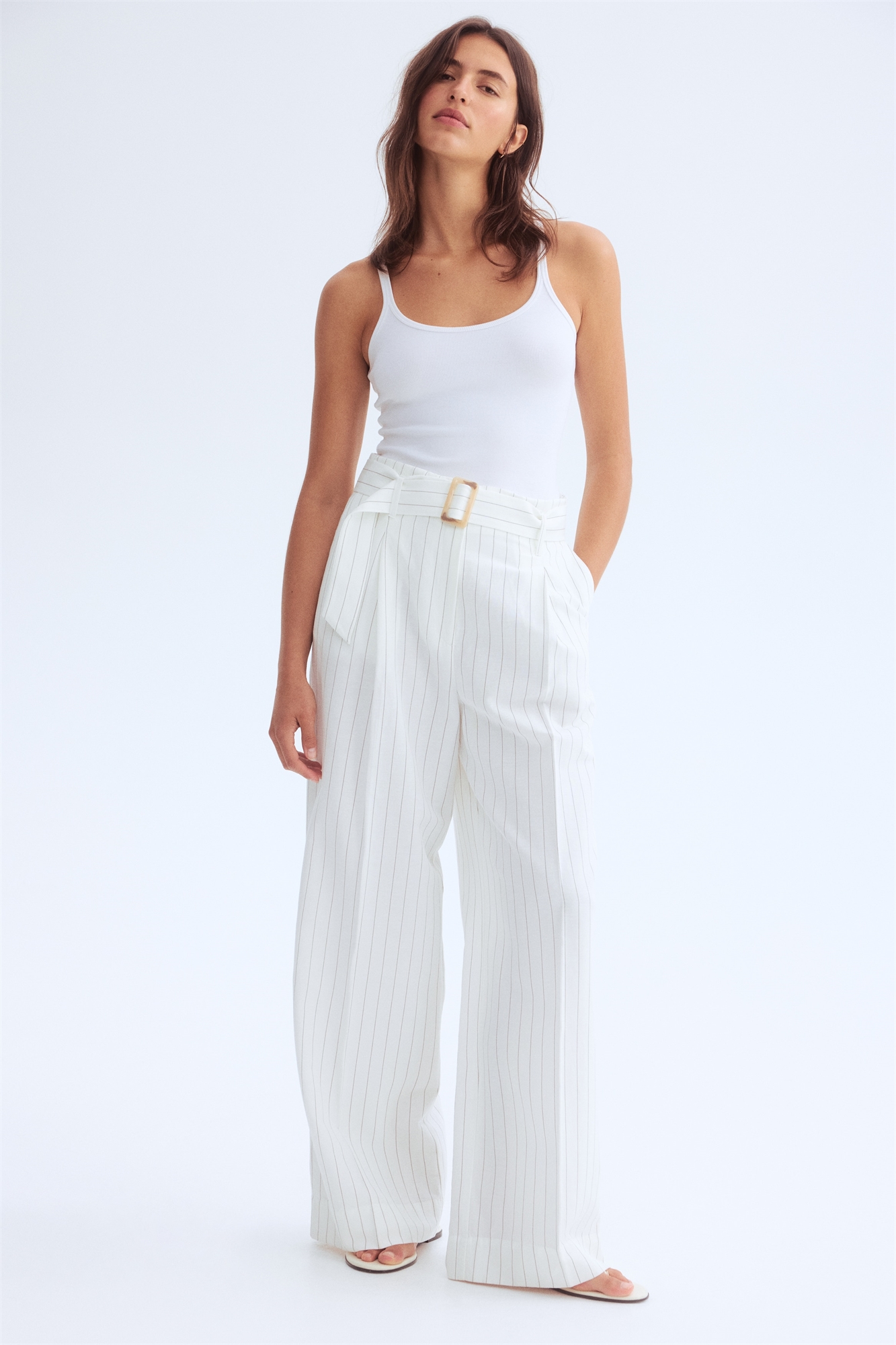 Приталенные брюки из тканого материала из смеси льна. Высокая талия, съемный пояс с прямоугольной пряжкой и ширинка на молнии с потайной застежкой на крючок и планку. Диагональные боковые карманы, втачные карманы сзади и широкие ноги со складками спереди и складками спереди и сзади.