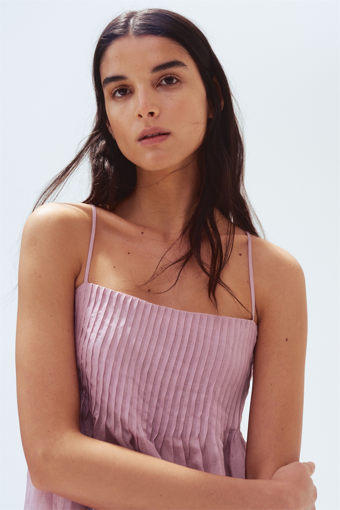 Топ из воздушного плетения рами с бретелями-спагетти и приталенной, приталенной частью в верхней части. Потайная застежка-молния с одной стороны и расклешенный живот.