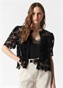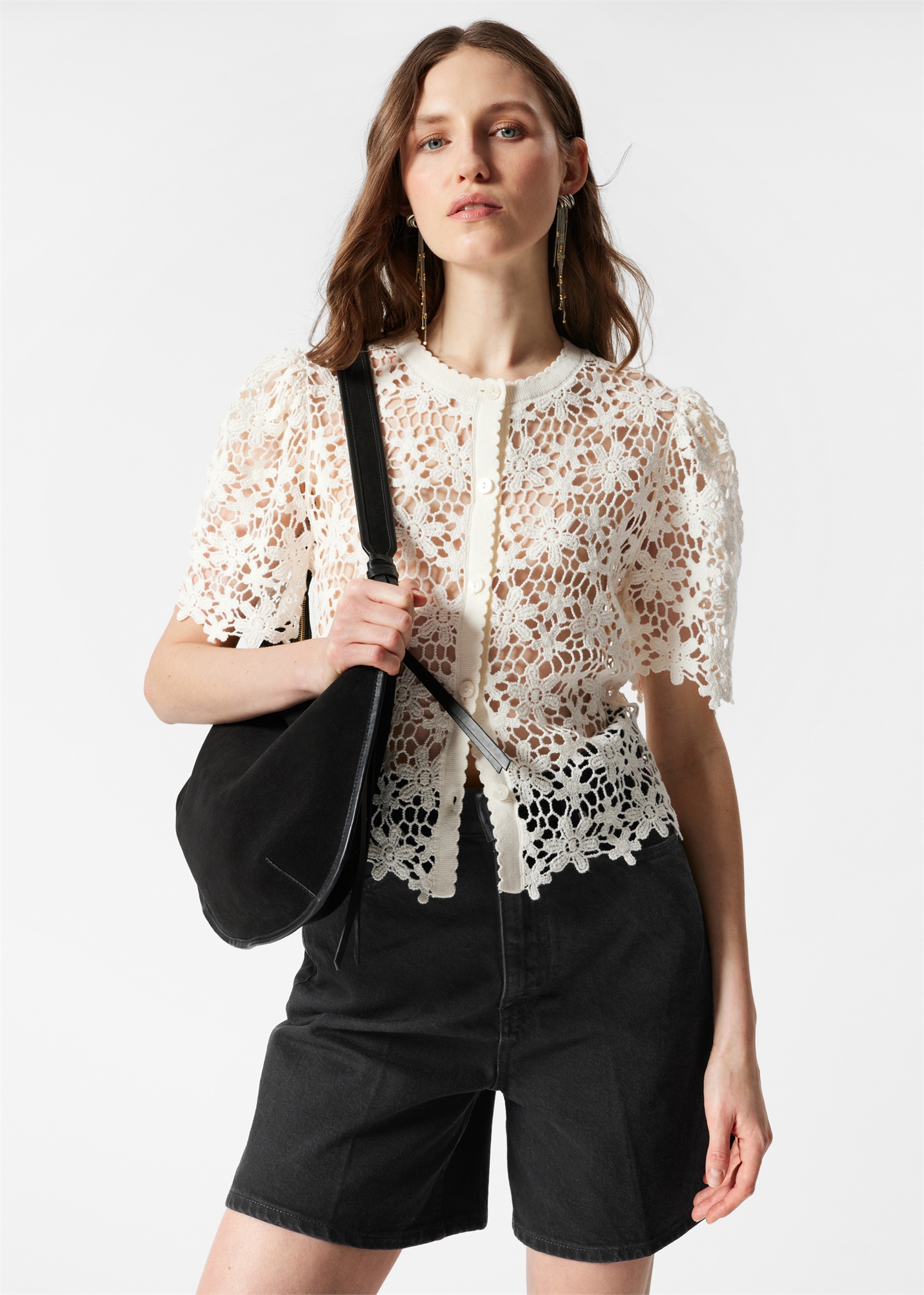 Этот кардиган с короткими рукавами выполнен из чистого хлопка ажурным вязанием крючком с замысловатым цветочным узором. Модель имеет укороченный силуэт, мягкие рукава-бабочки, отделку в виде гребешков и застежку на пуговицы спереди. Надевайте его поверх камзолов и платьев или носите как самостоятельную вещь. Длина кардигана: 53 см / 20,8 дюйма (размер S)