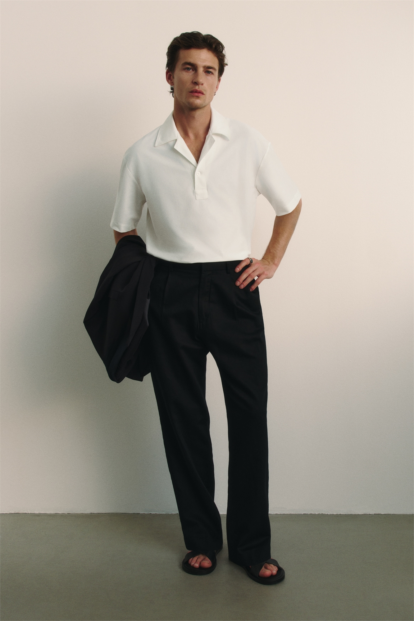 Рубашка-поло с короткими рукавами из мягкого трикотажа из смеси хлопка с курортным воротником, застежкой на одну пуговицу и прямым покроем подола с небольшим разрезом с каждой стороны. Свободный крой для создания объемного, но не чрезмерно большого силуэта.