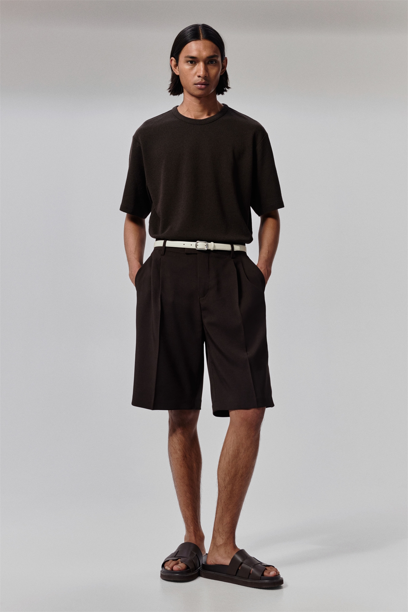 Футболка в стиле бокси из джерси с круглым вырезом с ребристой отделкой, спущенными плечами и прямым покроем. Свободный крой для пышного, но не слишком большого силуэта.