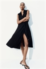 Платье длиной до колен, без рукавов, из тканого материала, с открытым воротником и облегающим передом с потайной пуговицей и кнопками. Узкий пояс-завязка из ткани с покрытием на талии. На подкладке.