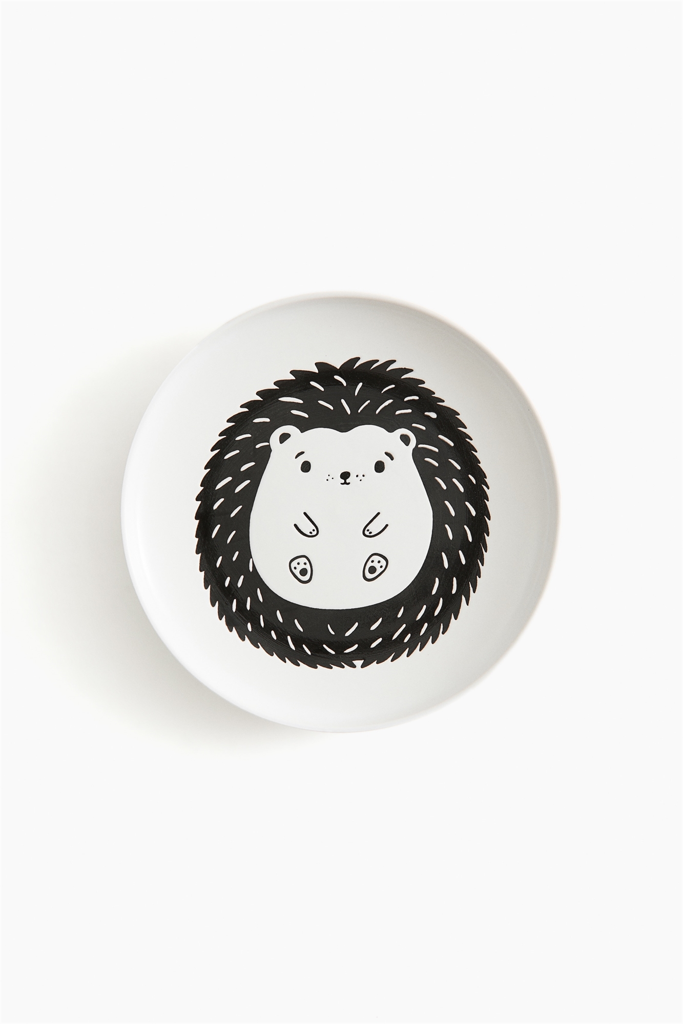 Тарелка из керамогранита с мягко изогнутыми краями, полуматовым покрытием и очаровательным принтом в центре.
