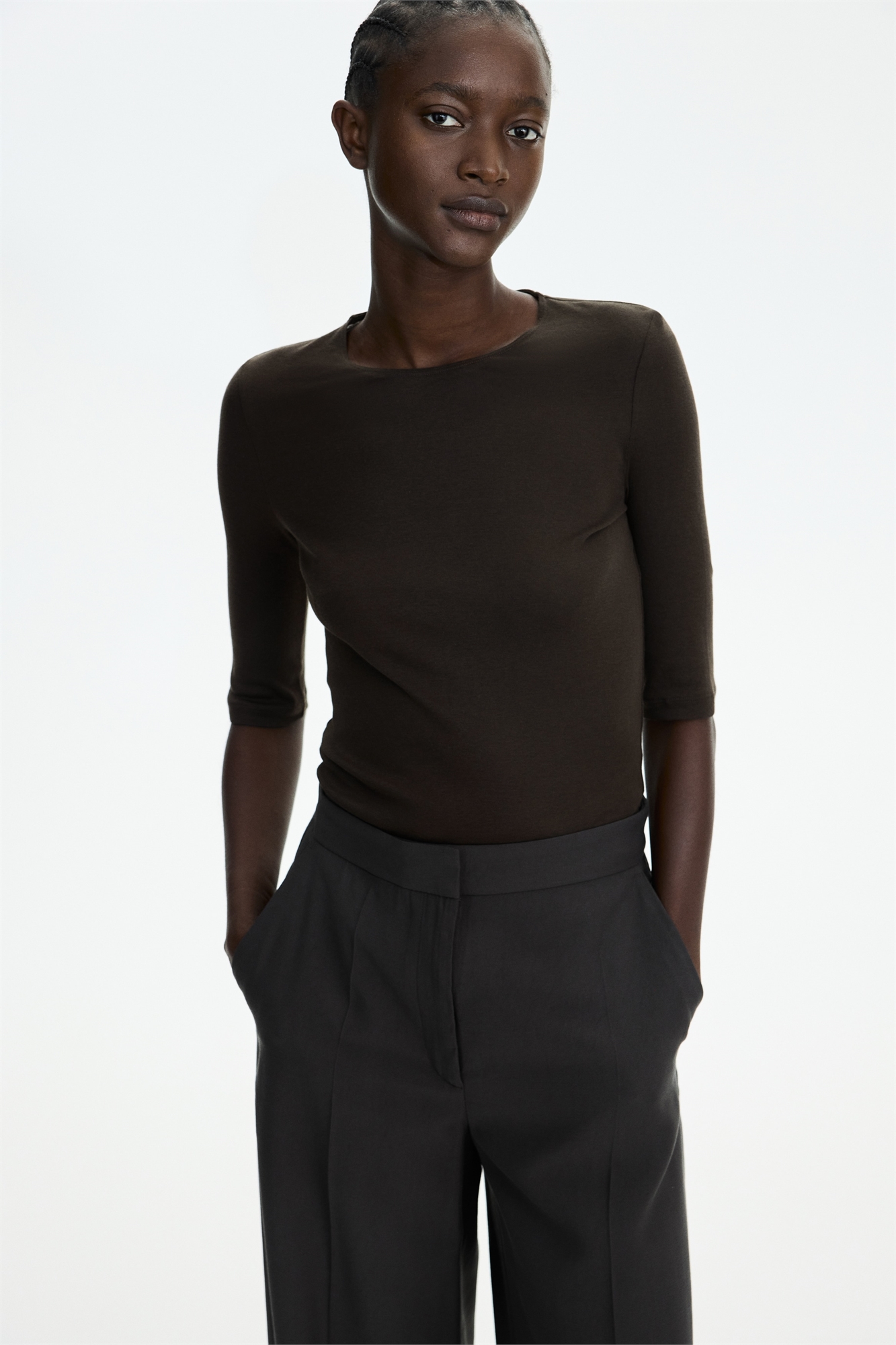 Длинная приталенная футболка из легкого хлопкового джерси пима с круглым вырезом и узкой окантовкой и рукавами, заканчивающимися чуть выше локтей.