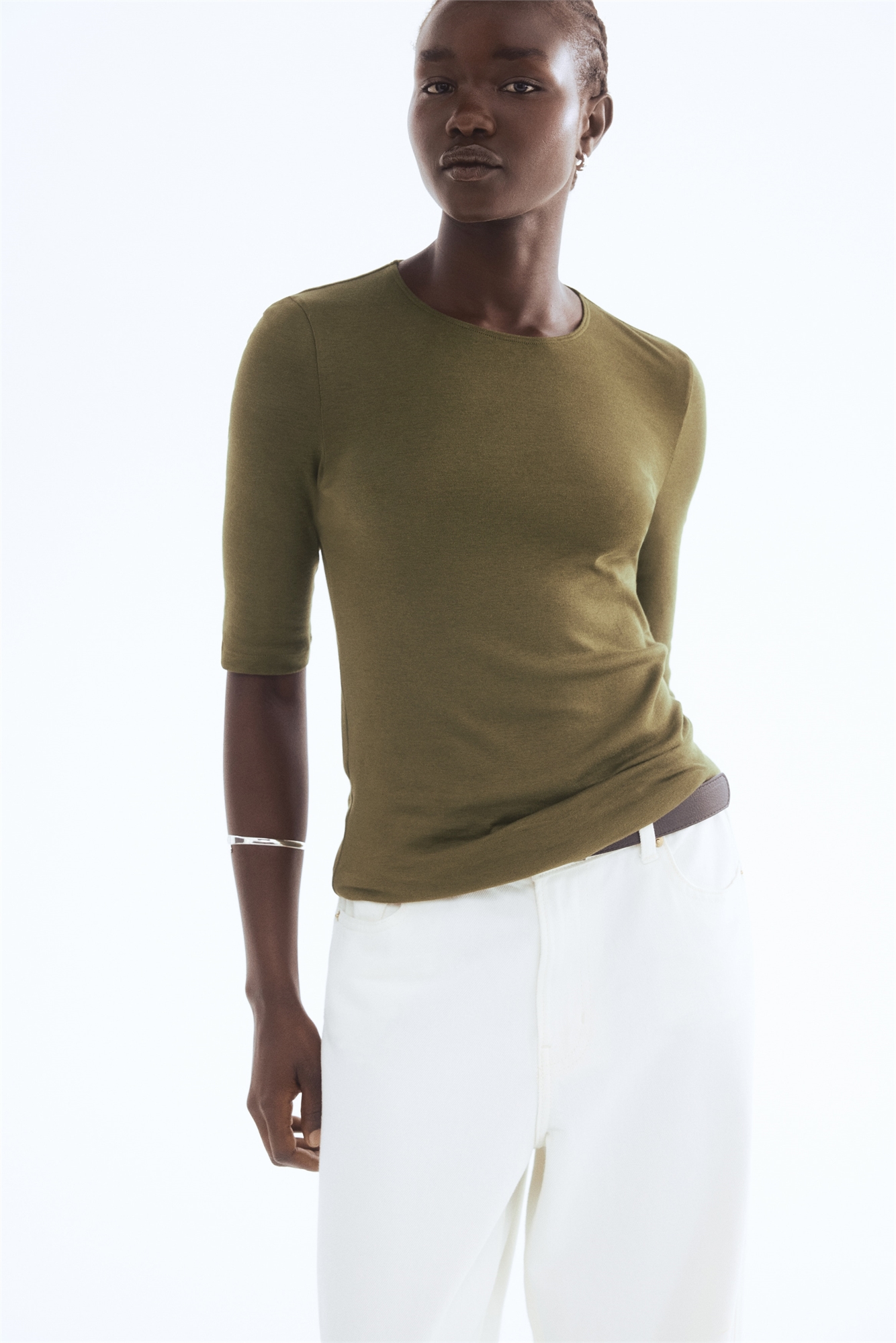 Длинная приталенная футболка из легкого хлопкового джерси пима с круглым вырезом и узкой окантовкой и рукавами, заканчивающимися чуть выше локтей.