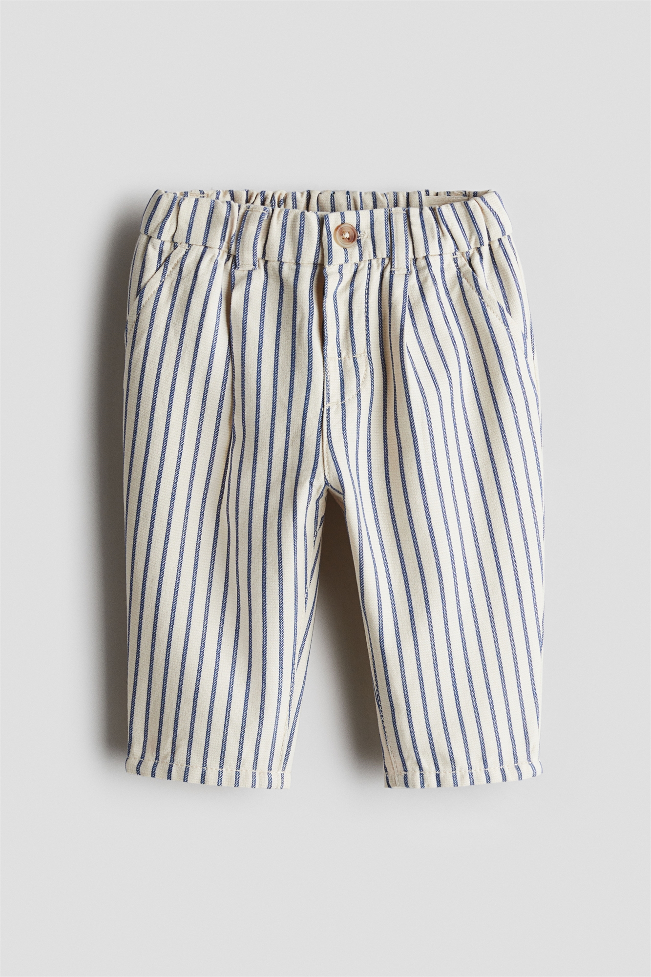 Брюки из мягкого хлопкового полотна с регулируемым эластичным поясом, фальшивой ширинкой с пуговицей и декоративными карманами спереди и сзади.