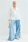 Свободные брюки из денима с эластичным поясом и широкими штанинами с высоким разрезом и четырьмя узкими завязками с одной стороны штанины.