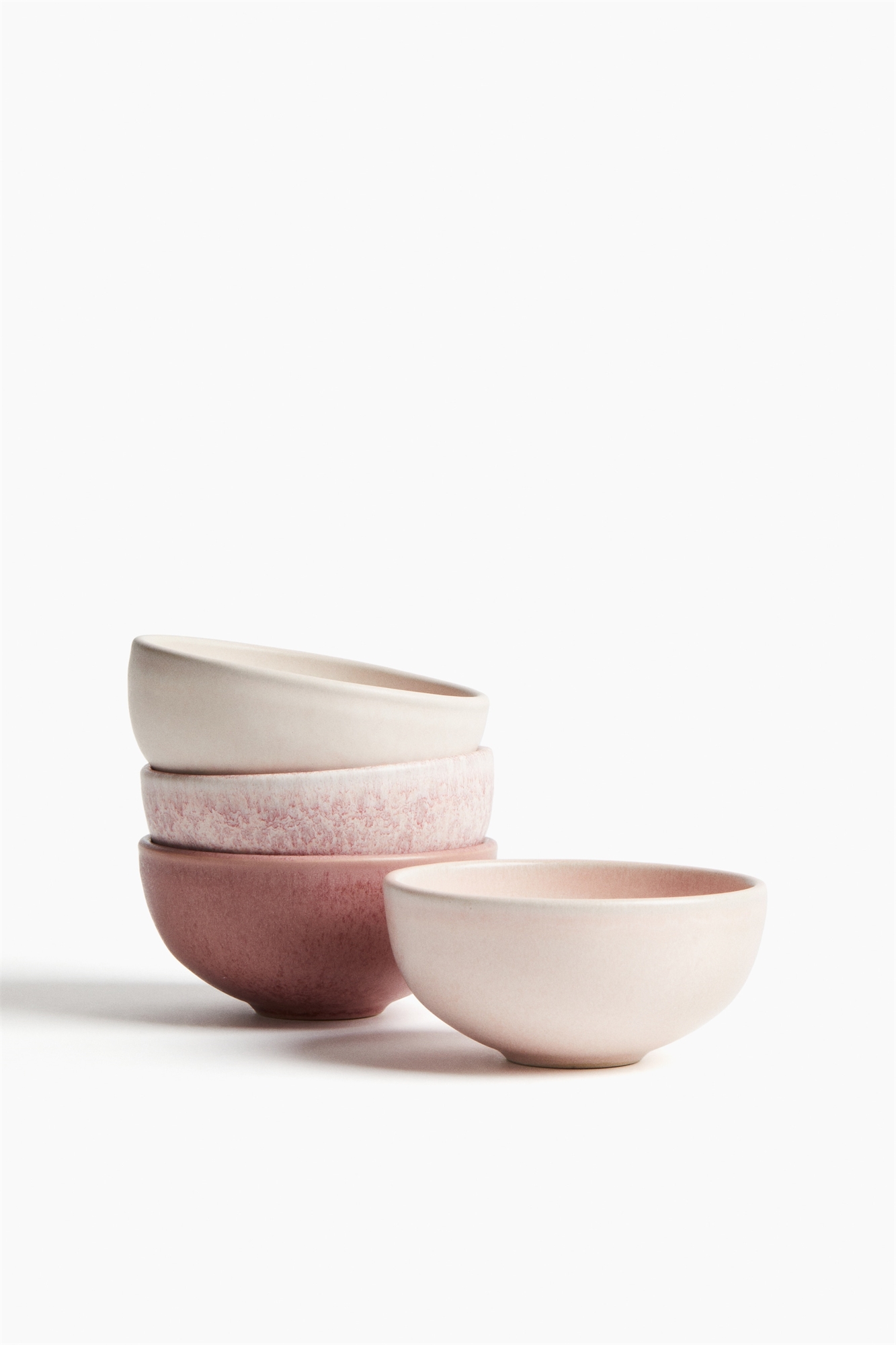 Четыре миски из керамики классической формы с искусной отделкой. Миски покрыты реактивной глазурью, которая создает красивую пеструю окраску, придавая каждой из них уникальный вид.