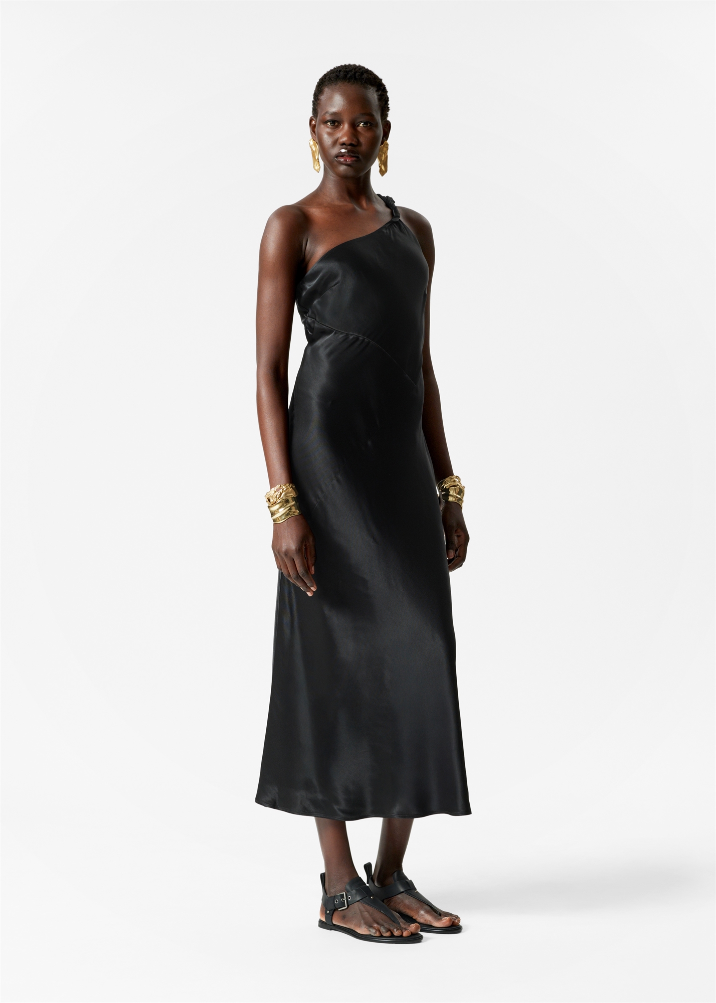 Это платье-миди сшито из атласа, придающего ему эластичность и блеск. Платье облегающего силуэта на одно плечо с перекрученным ремешком. Модель дополнена потайной застежкой-молнией в боковом шве. Дополните его яркими украшениями и туфлями на шпильке. Длина платья: 141,5 см / 55,7" (EU 36 / UK 8 / US 4)