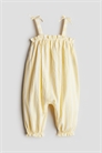 Ромпер-комбинезон из мягкого махрового трикотажа с принтом на всю длину. Квадратный вырез и узкие бретели с декоративными завязками в верхней части. Узкая эластичная резинка и отделка жабо в верхней части и по краям.