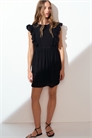 Короткое платье из тканого материала с декоративной плиссировкой и кружевными вставками. Силуэт без рукавов, приталенный лиф с оборками по бокам, переходящими на плечи и спину. Круглый вырез с отверстием для ключа и застежкой на пуговицу сзади. Аккуратная расклешенная юбка. Потайная застежка-молния с одной стороны. Частично на подкладке.