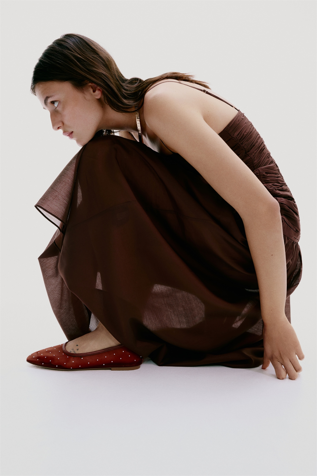 Балетки из сетки, украшенные сверкающими стразами. Квадратные мыски, переплетение из ткани с покрытием вокруг отверстий и петля сзади.
