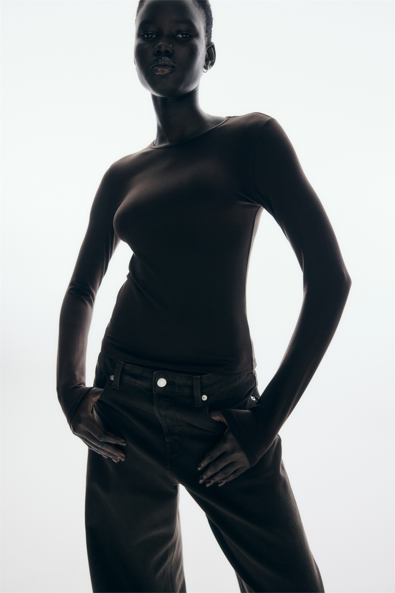 Облегающий топ с длинными рукавами из мягкого трикотажа-стрейч. Круглый вырез и прямой подол.
