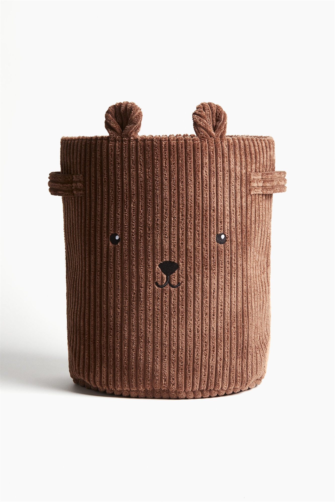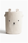 Корзина для хранения из мягкого шнура с аппликацией в виде ушек и милыми вышитыми чертами лица. Ручки по бокам для удобства переноски.