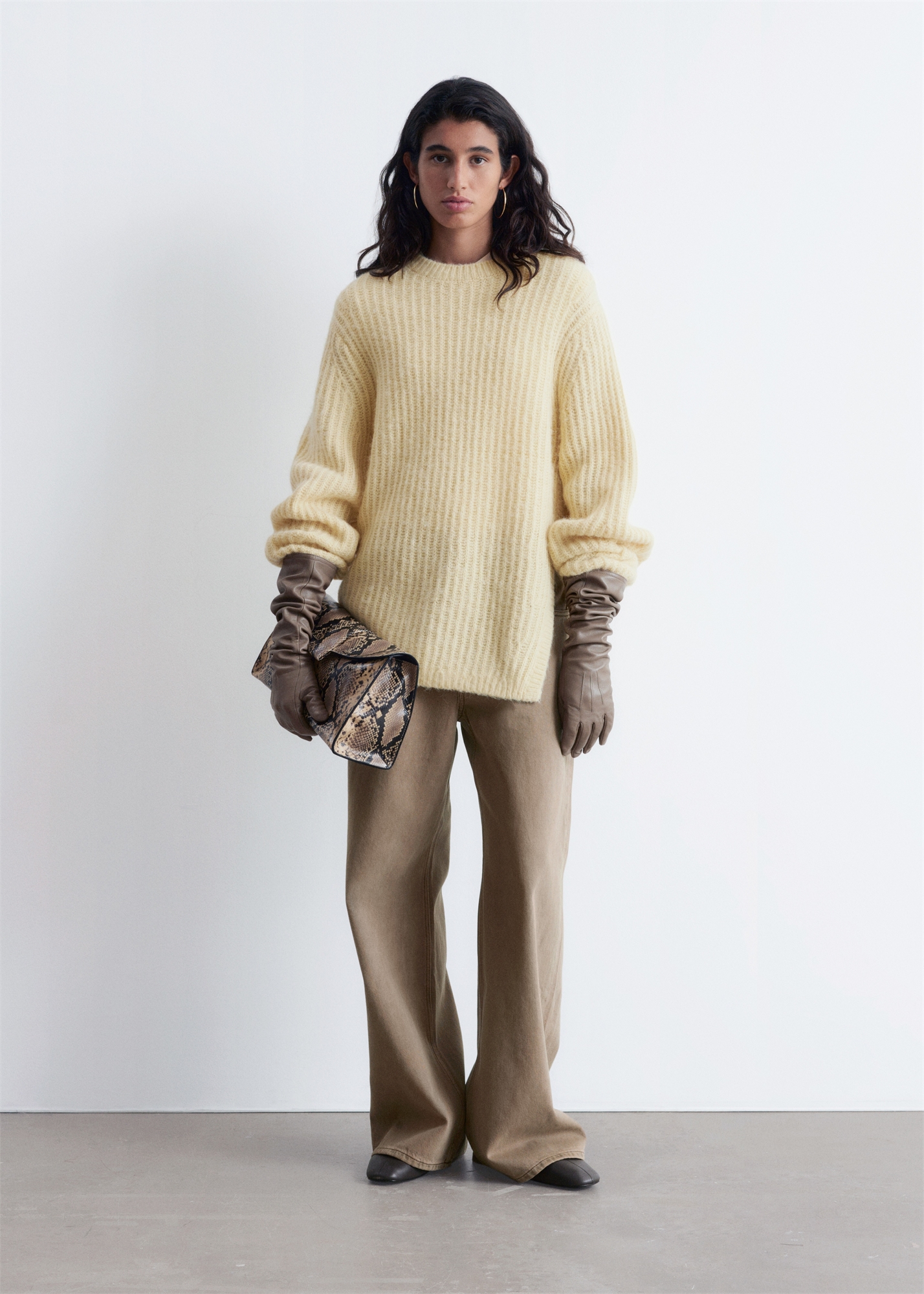 Этот свитер связан из смеси шерсти мериноса и альпаки. Он имеет длинный силуэт оверсайз, круглый вырез, объемные рукава и ребристую отделку. Модель дополнена высоким разрезом на подоле. 50% RWS Wool TE-00047206 28% RAS Alpaca TE-00047206 Длина свитера: 69 см / 27,2" (размер S)