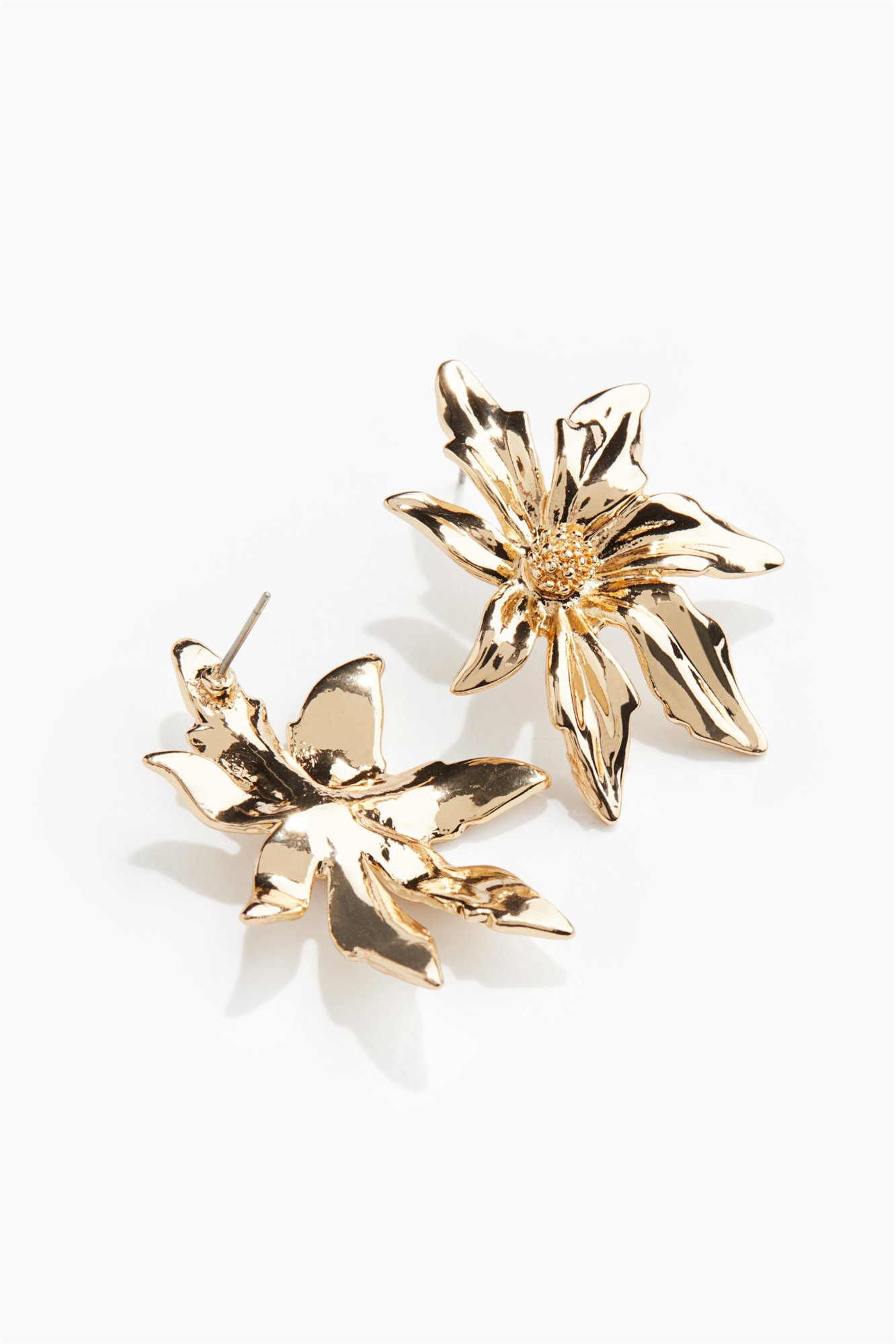 Блестящие металлические серьги в форме цветка с маленькими бусинами в центре.