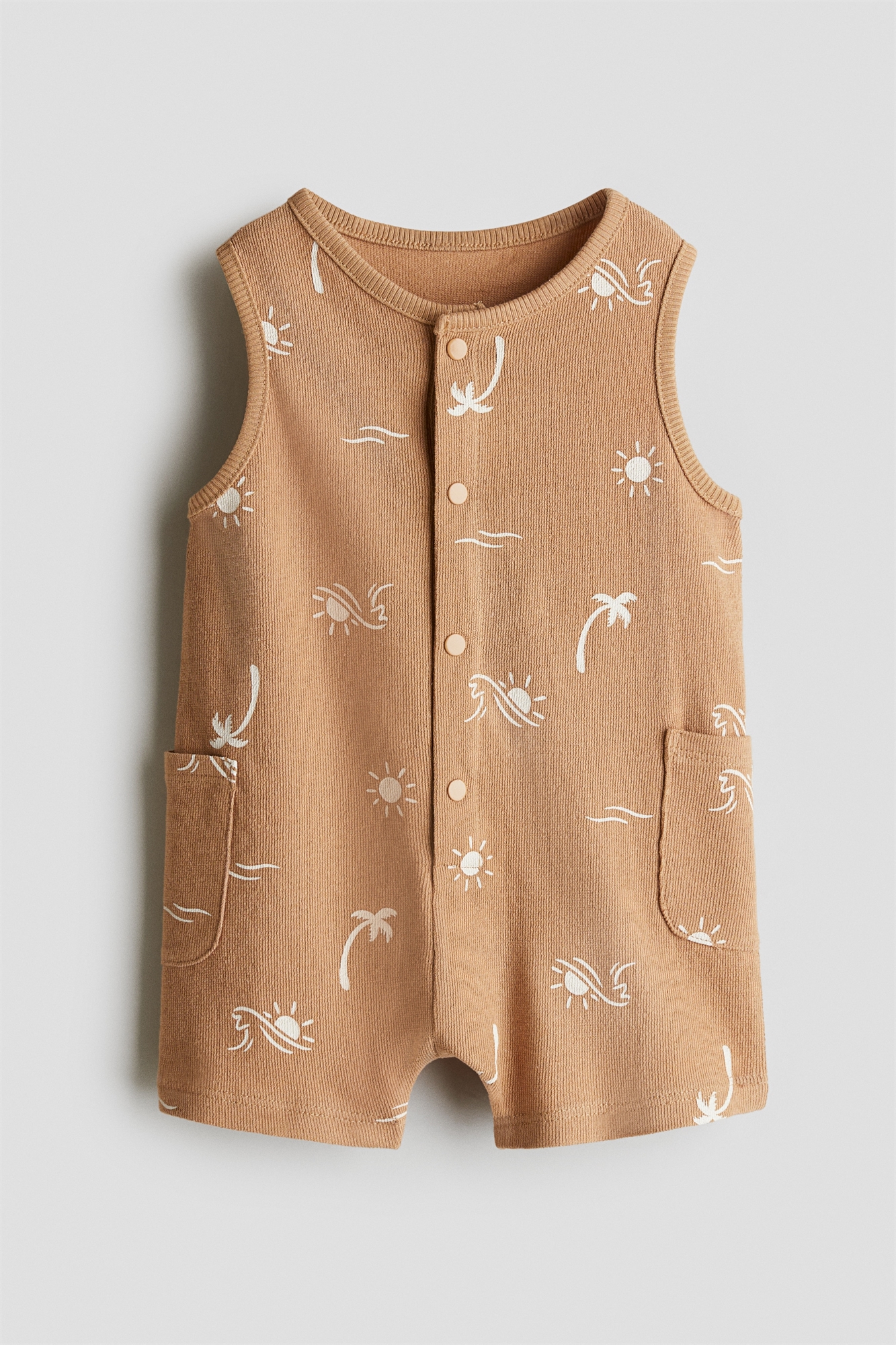 Ромпер без рукавов из мягкой и легкой махровой ткани с принтом на всю длину. Круглый вырез с ребристой отделкой, застежки спереди и накладные карманы по бокам.