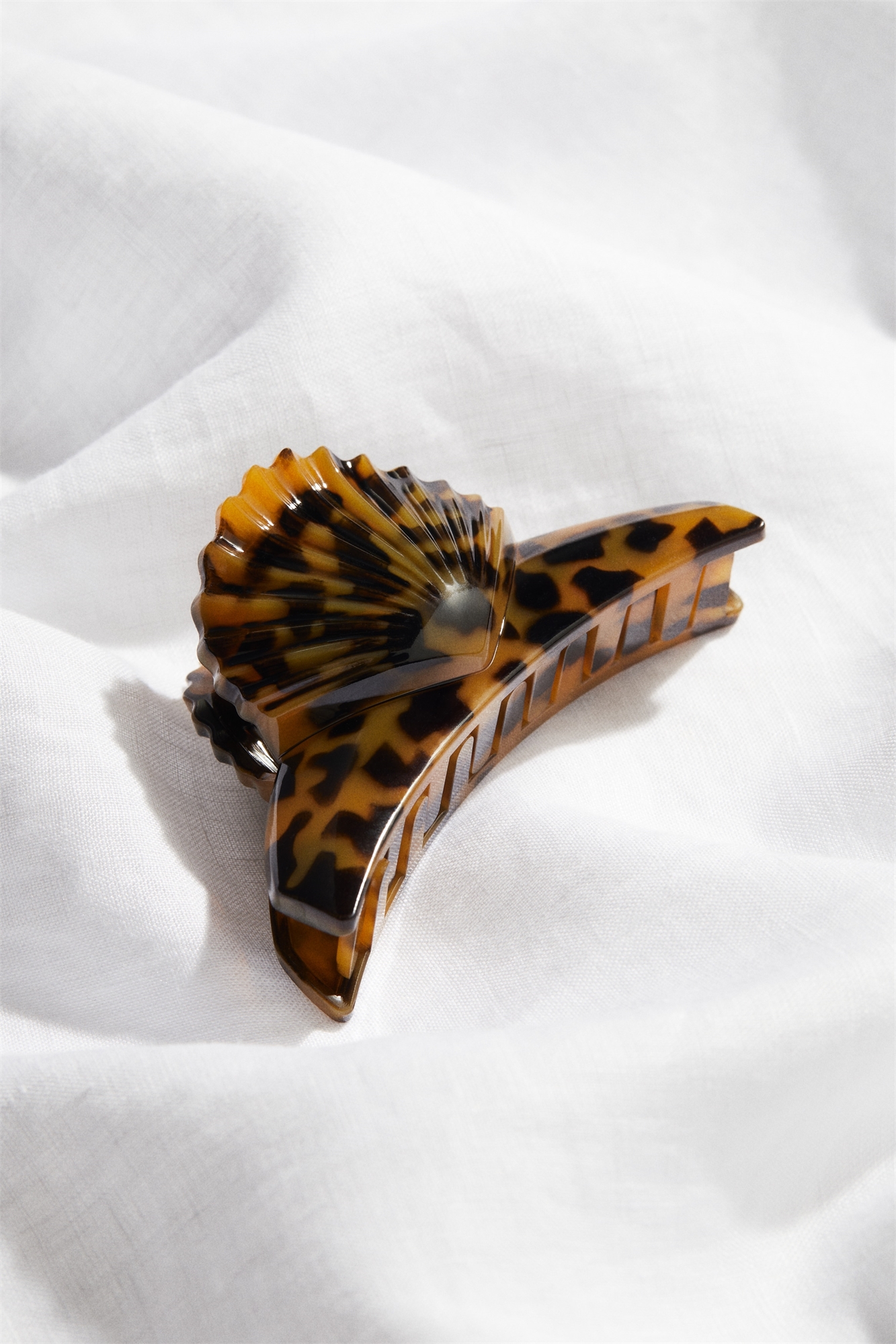 Коготь для волос из узорчатого пластика с деталью в виде ракушки.