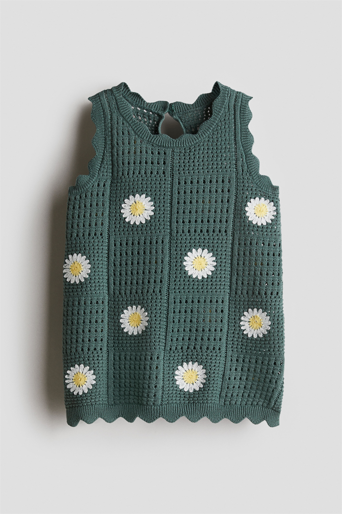Платье А-линии из хлопкового трикотажа с вышитыми мотивами. Круглый вырез, отверстие для ключа с пуговицей сзади и гребешковая отделка контрастного цвета.