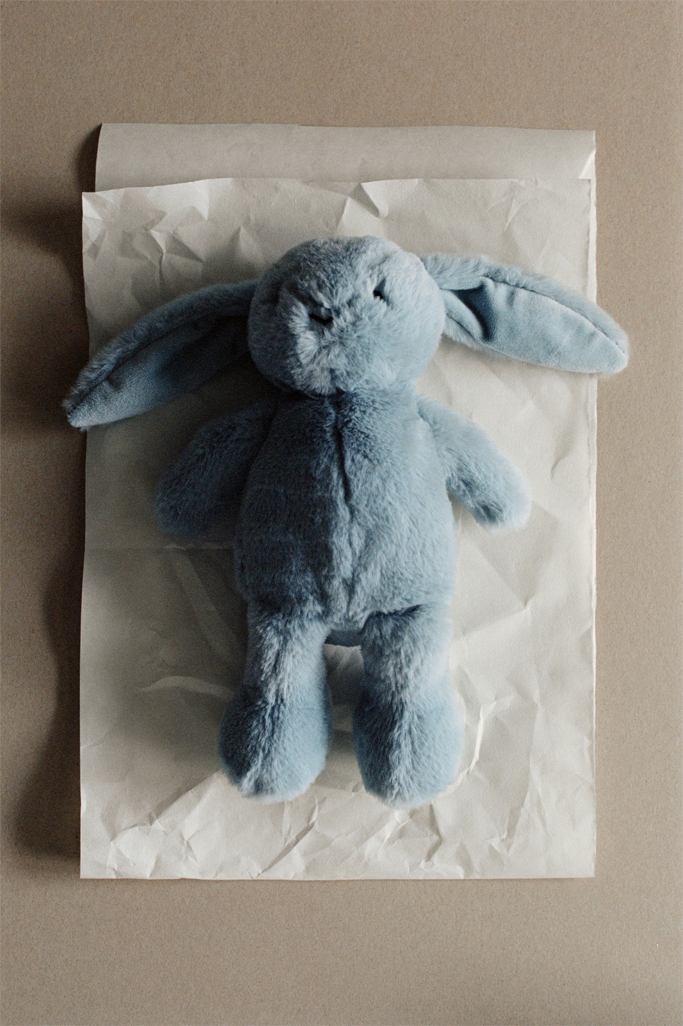 Мягкая игрушка из мягкого ворса в виде зайчика с милыми, вышитыми чертами лица.