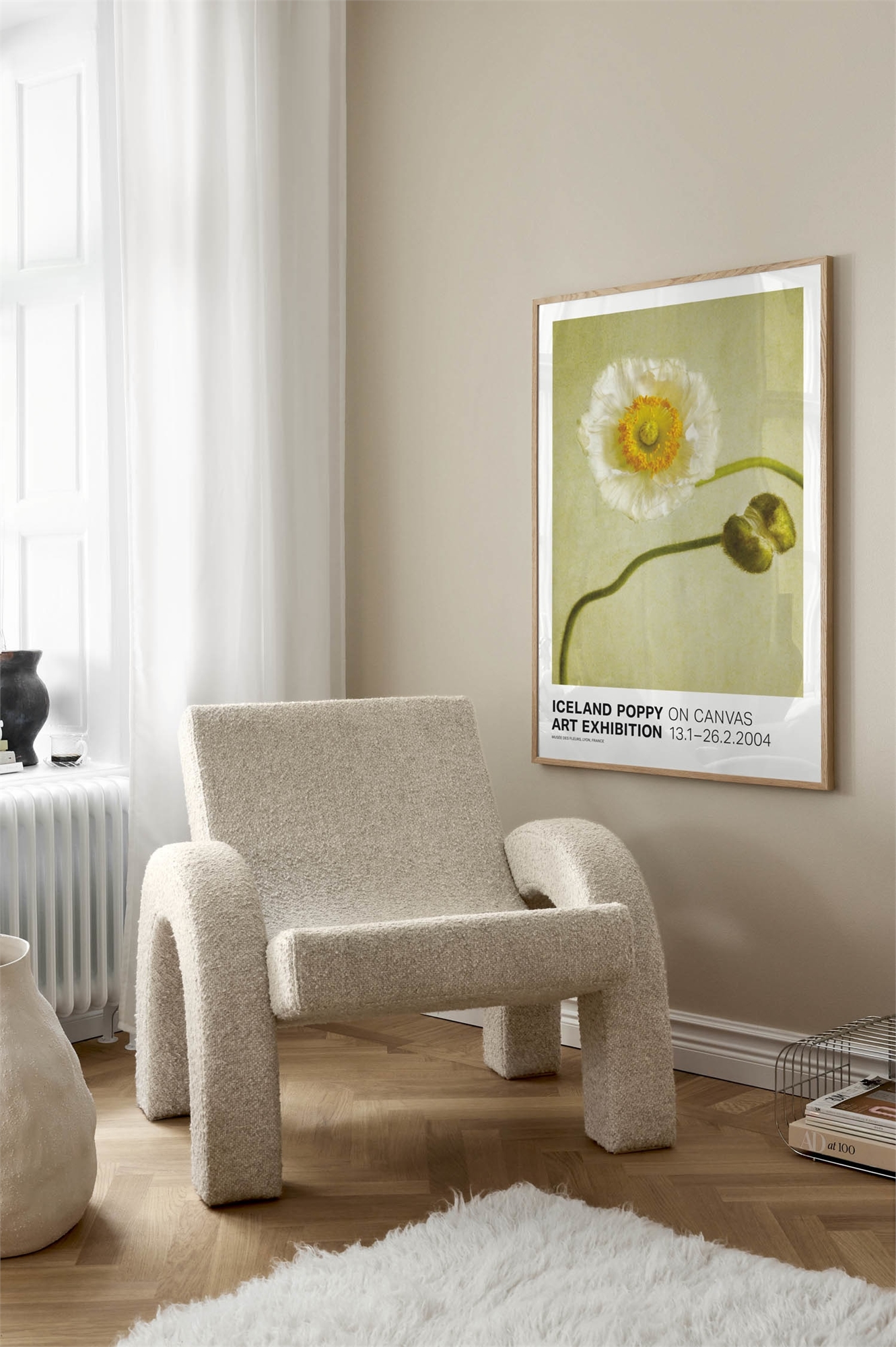 Фотография камня и увядшего желтого цветка. Вокруг мотива написан текст на французском языке. Мотив обрамлен встроенным бежевым паспарту.