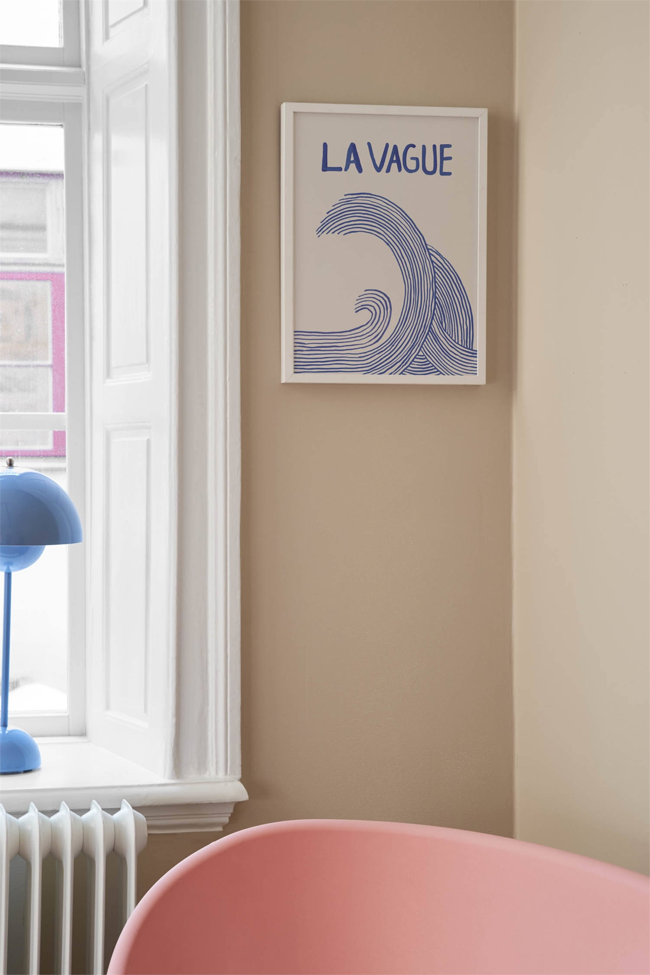 На бежевом фоне вручную нарисован мотив, изображающий синие линии, создающие волну. Над волной написано слово на французском языке. Мотив является частью коллекции "Ателье № 03", созданной нашими дизайнерами для Postery Atelier.