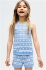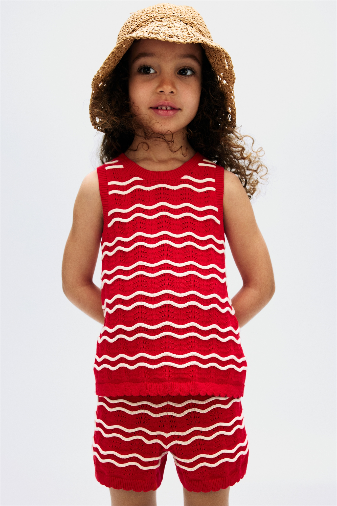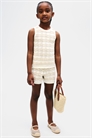 Комплект из жилета и шорт из мягкого трикотажного хлопка с пуантелью и гребешковой отделкой. Жилет с круглым вырезом горловины с ребристой отделкой, отверстием для ключа и пуговицей сзади, а также тесемками по проймам и подолу. Шорты с эластичной талией и ребристой отделкой по подолу.