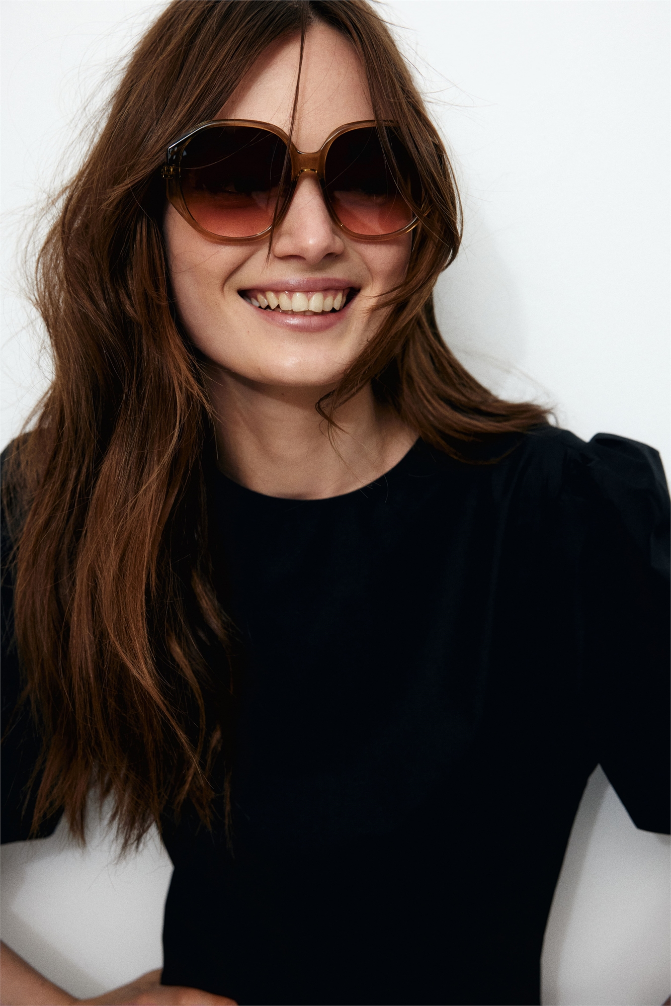 Большие солнцезащитные очки в ретро-стиле с пластиковой оправой и боковыми дужками. Тонированные пластиковые линзы с защитой от ультрафиолета.