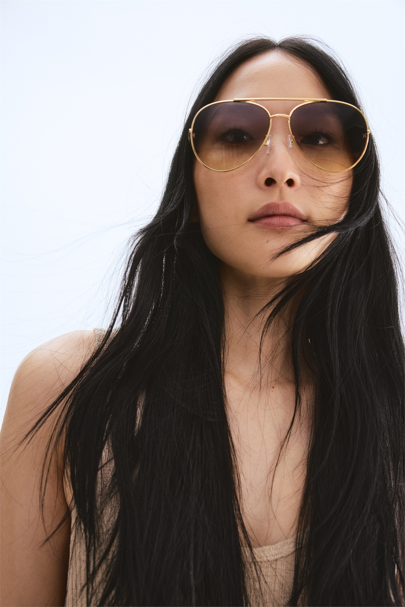 Солнцезащитные очки в стиле "авиатор" с металлической оправой и боковыми дужками, регулируемыми носовыми упорами и тонированными пластиковыми линзами с УФ-защитой.